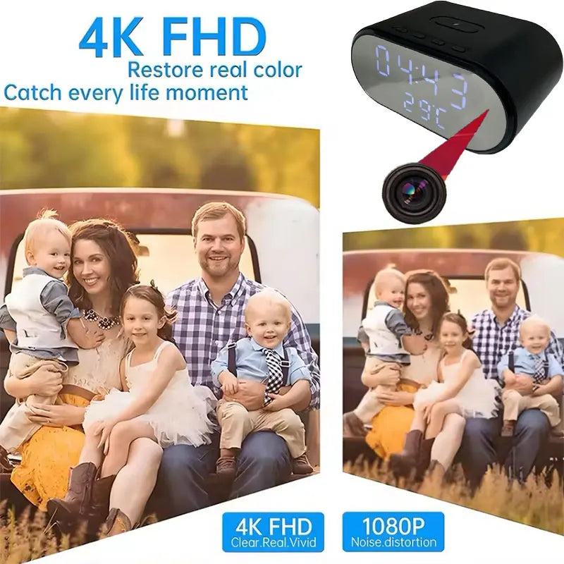 4K HD WiFi6 Alarm Clock Camera with Wireless Charger — Kompaktní noční kamera a bezdrátová nabíjecí stanice kombinující 4K video, WiFi6 připojení, AI detekci lidí a zobrazení teploty pro diskrétní domácí monitorování a pohodlné nabíjení zařízení.