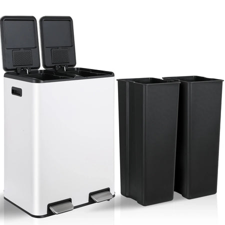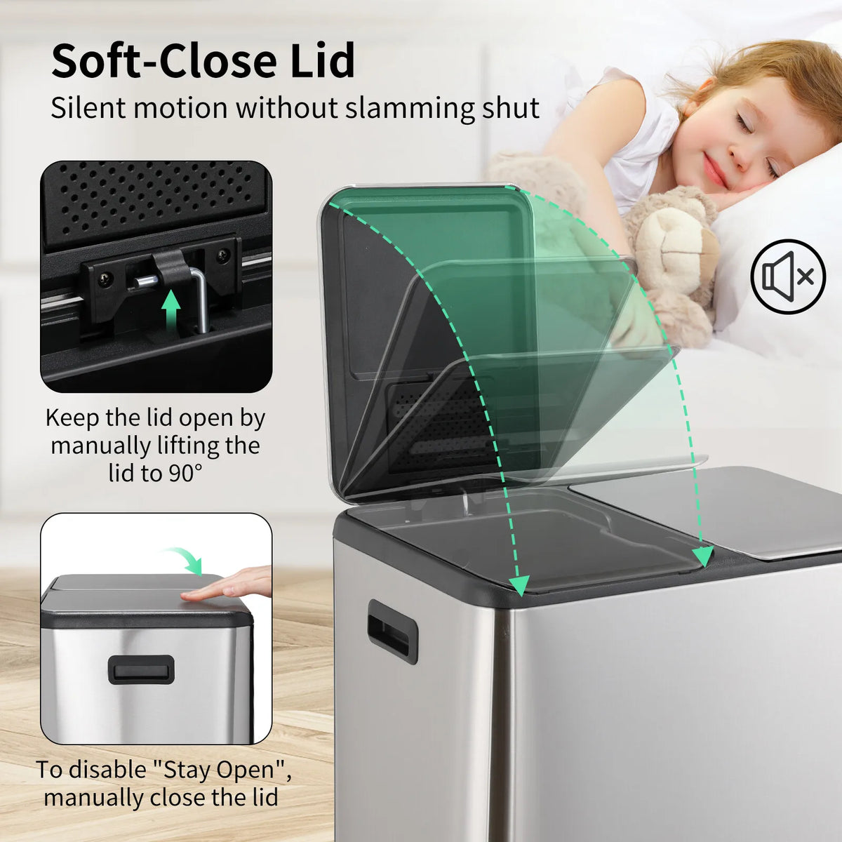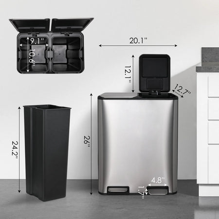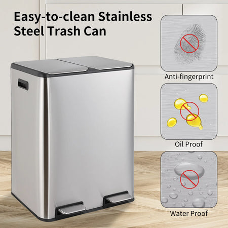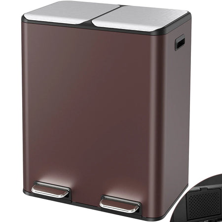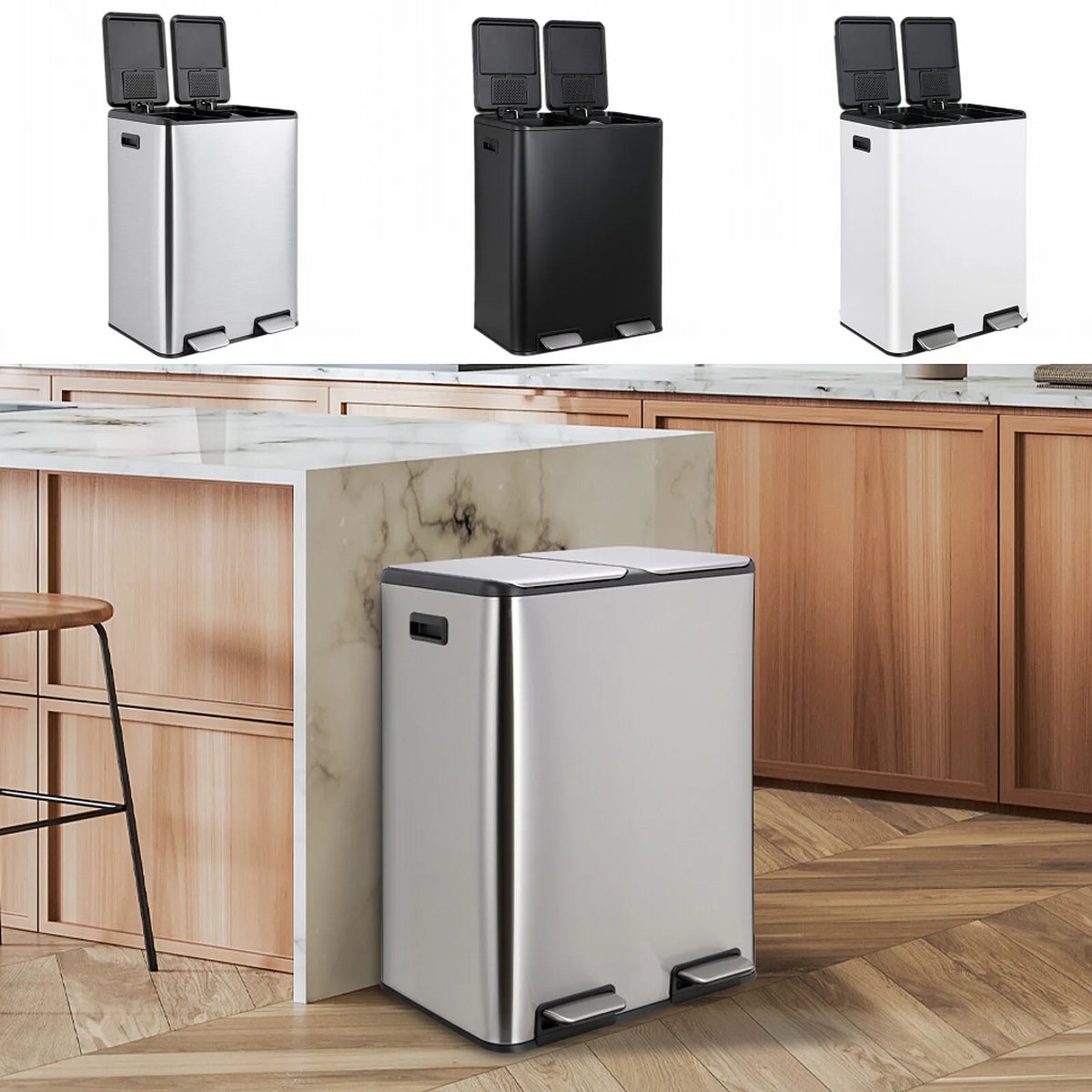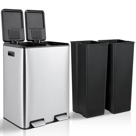Objevte dvojitý nerezový odpadkový koš s vestavěným filtrem—stylové, vysoce kapacitní řešení navržené pro moderní domovy a kanceláře. S velkorysou kapacitou 60 L (16 gal) a dvěma nezávislými oddíly můžete udržovat odpadky a recyklaci pěkně oddělené, čímž snižujete zápach a zjednodušujete správu odpadu. Vnější plášť je vyroben z nerezové oceli 410 odolné proti otiskům prstů pro elegantní, odolný povrch, který se snadno čistí. Uvnitř jsou dvě odnímatelné ABS vnitřní nádoby s kapsami na pytle, které udržují vložky na svém místě, což usnadňuje rychlou a úhlednou výměnu pytlů.