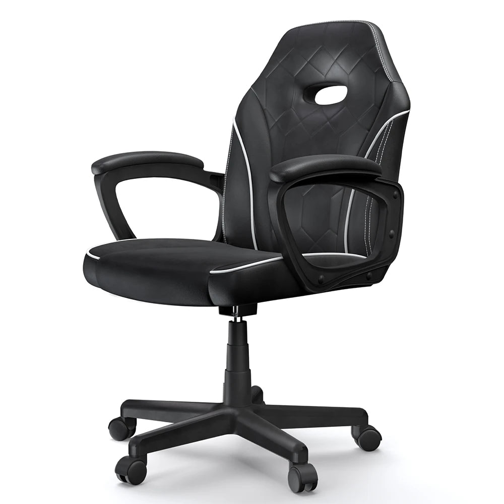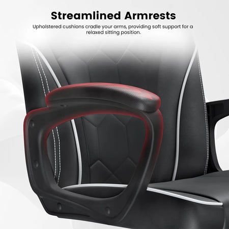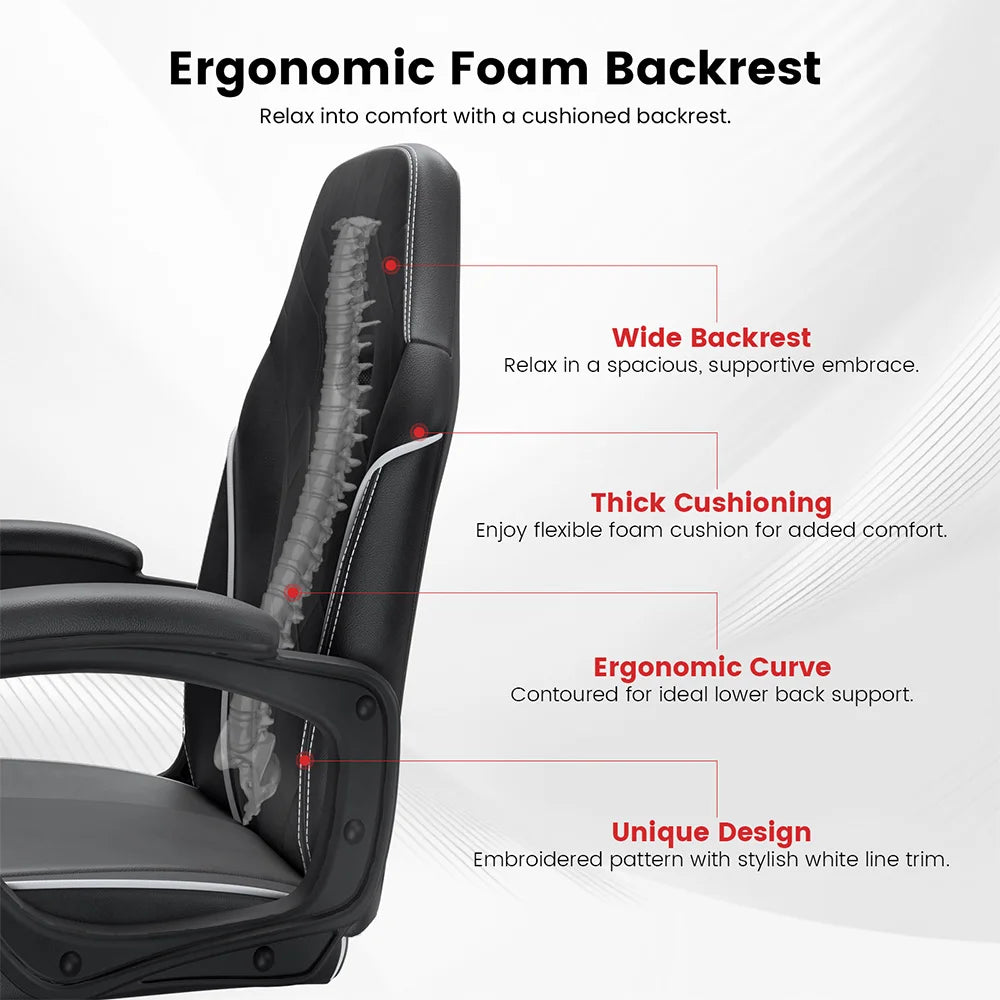 Zažijte celodenní pohodlí a zaměřený výkon s ergonomickou herní kancelářskou židlí CG-4746 od ACGAM. Tato židle kombinuje ergonomické prémiové pěnové opěradlo s měkkou PVC kůží, která objímá vaši páteř, podporuje vaši dolní část zad a snižuje únavu během dlouhých pracovních sezení nebo herních maratonů. Její široké sedadlo a silný pěnový polštář se přizpůsobují vašemu tělu pod tlakem, což podporuje lepší držení těla každou hodinu, kdy sedíte. Elegantní vyšívaný vzor s stylovým bílým lemem dodává nádech sofistikovanosti jakémukoli pracovnímu uspořádání, ať už pracujete, streamujete nebo studujete. Užijte si hladký pohyb s 360° otáčením a snadným nastavením výšky, abyste se dokonale sladili se svým stolem. Aerodynamické PP opěrky s PVC podložkami, spojené s odolným mechanismem z kovové desky a robustní nylonovou základnou, poskytují spolehlivou podporu a pohodlí pro dlouhodobé používání, až do 300 lbs.