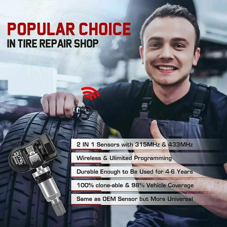 - 2‑v‑1 pokrytí: Servis téměř každého vozidla vybaveného TPMS jedním senzorem (315/433 MHz) ke snížení nákladů na opravy a zvýšení efektivity instalace, bez nutnosti opětovného učení ve většině případů.