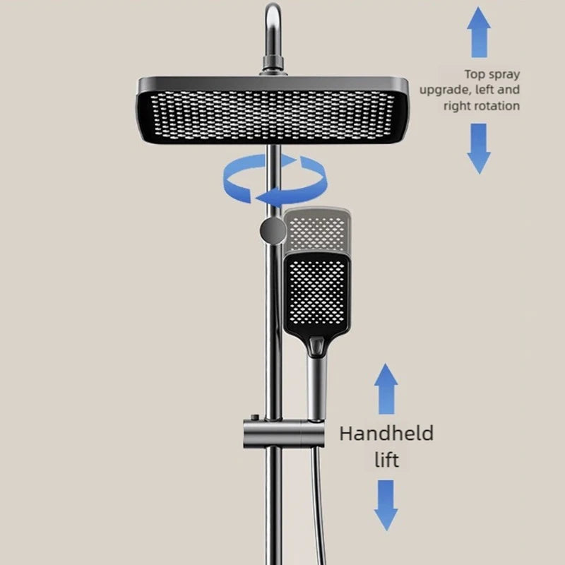 BusySink Sprchový Systém – Digitální Displej A Ambientní Osvětlení — moderní čtvercová sprchová deska s digitálním zobrazením teploty a integrovaným ambientním osvětlením, navržená pro přesnou kontrolu, elegantní hliníkovou konstrukci a nastavitelnou výšku pro prémiový zážitek ze sprchování.