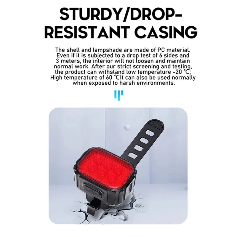 - Režimy: Přední světlo nabízí několik režimů (8 režimů osvětlení); Zadní světlo nabízí 12 režimů osvětlení; jednoduché ovládání tlačítkem přepíná mezi úrovněmi jasu a blikajícími vzory