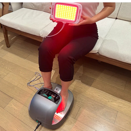 "Seznamte se s masážním přístrojem na nohy Terahertz s červeným a modrým světlem – 2-v-1 spa zařízení navržené k uklidnění unavených nohou, podpoře relaxace a celkovému blahu doma. Tento kompaktní masážní přístroj kombinuje pokročilou terahertzovou terapii s uklidňujícími sezeními s červeným a modrým světlem, aby pomohl snížit únavu nohou a osvěžit vaši každodenní rutinu. Snadno se používá a je přenosný, ideální pro regeneraci po práci, po cvičení nebo jako uklidňující noční rituál."