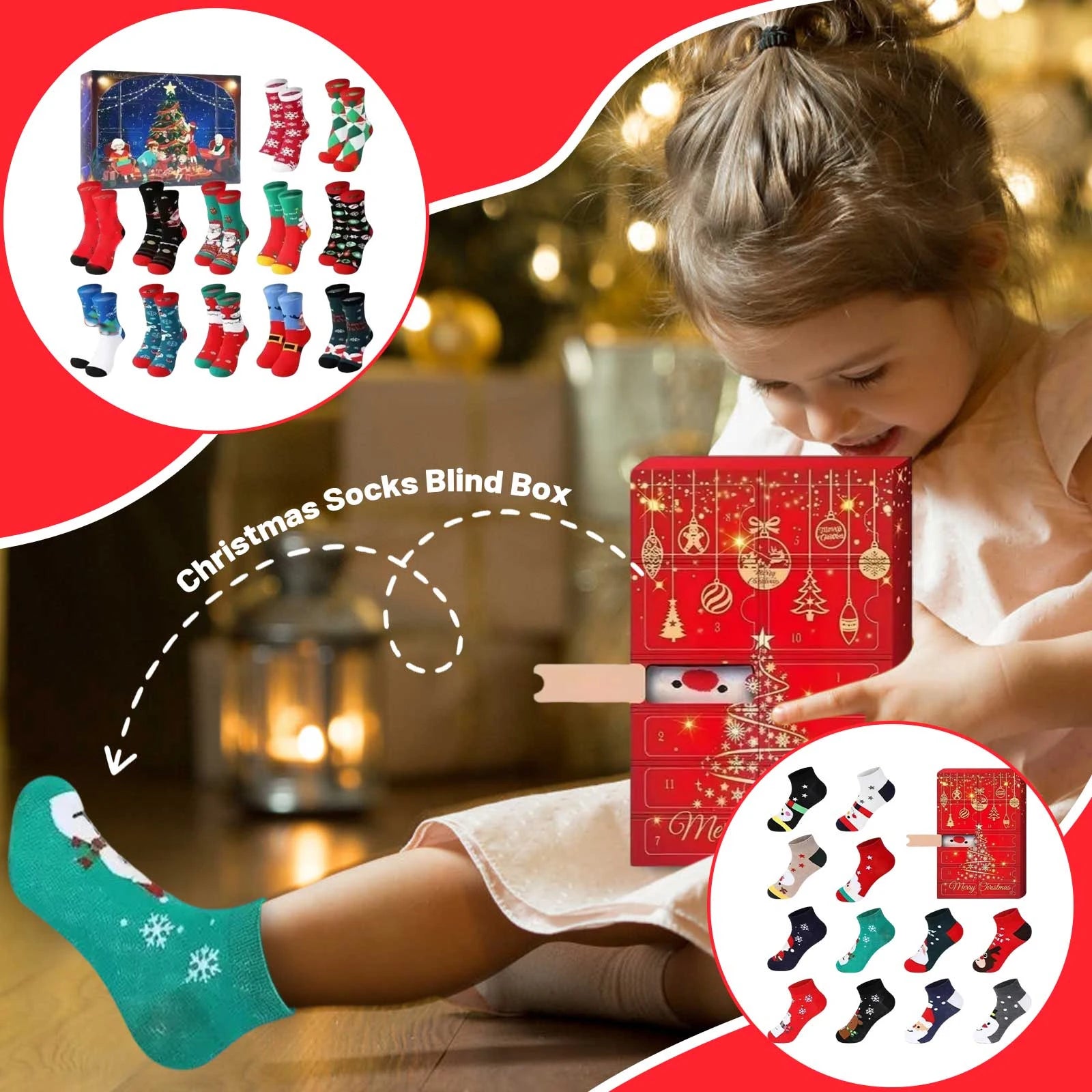 Kalendář se otevírá od 1. prosince a každý den přináší překvapení s náhodně umístěnými tematickými designy — Šílený Santa, Hbitý los, Třpytící se vánoční stromeček, Sněhové vločky snů a Tajemná dárková krabice, mezi ostatními. Celá rodina může sdílet očekávání, když odhalíte nový punčochový kalendář a každý den nosíte nový styl. Elastické manžety a zesílené paty zajišťují bezpečné a odolné nošení, které vydrží od Štědrého večera až do Silvestra.