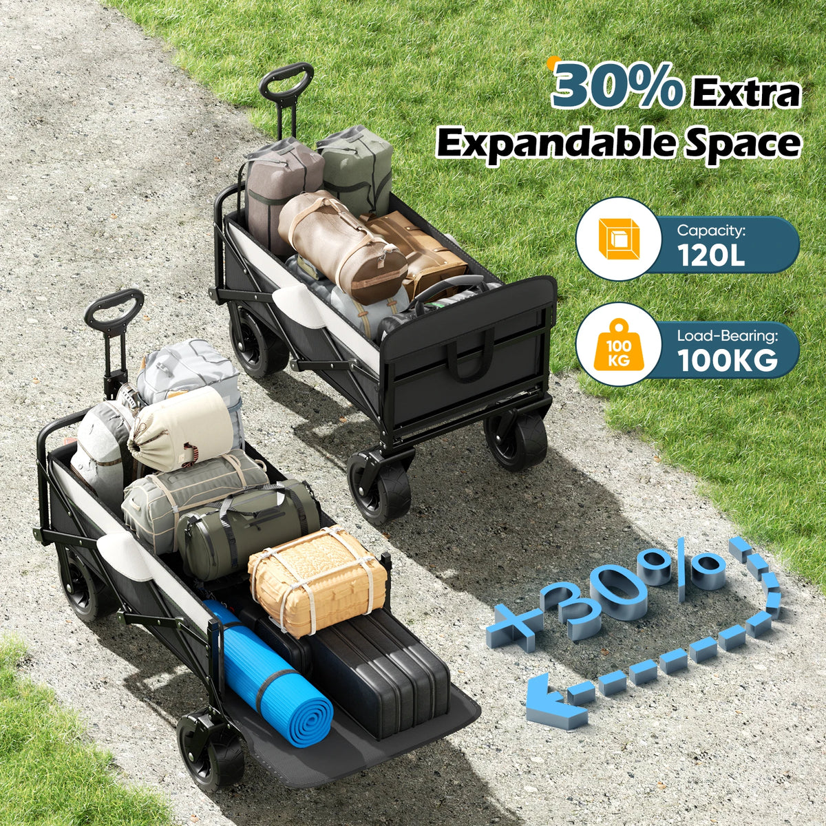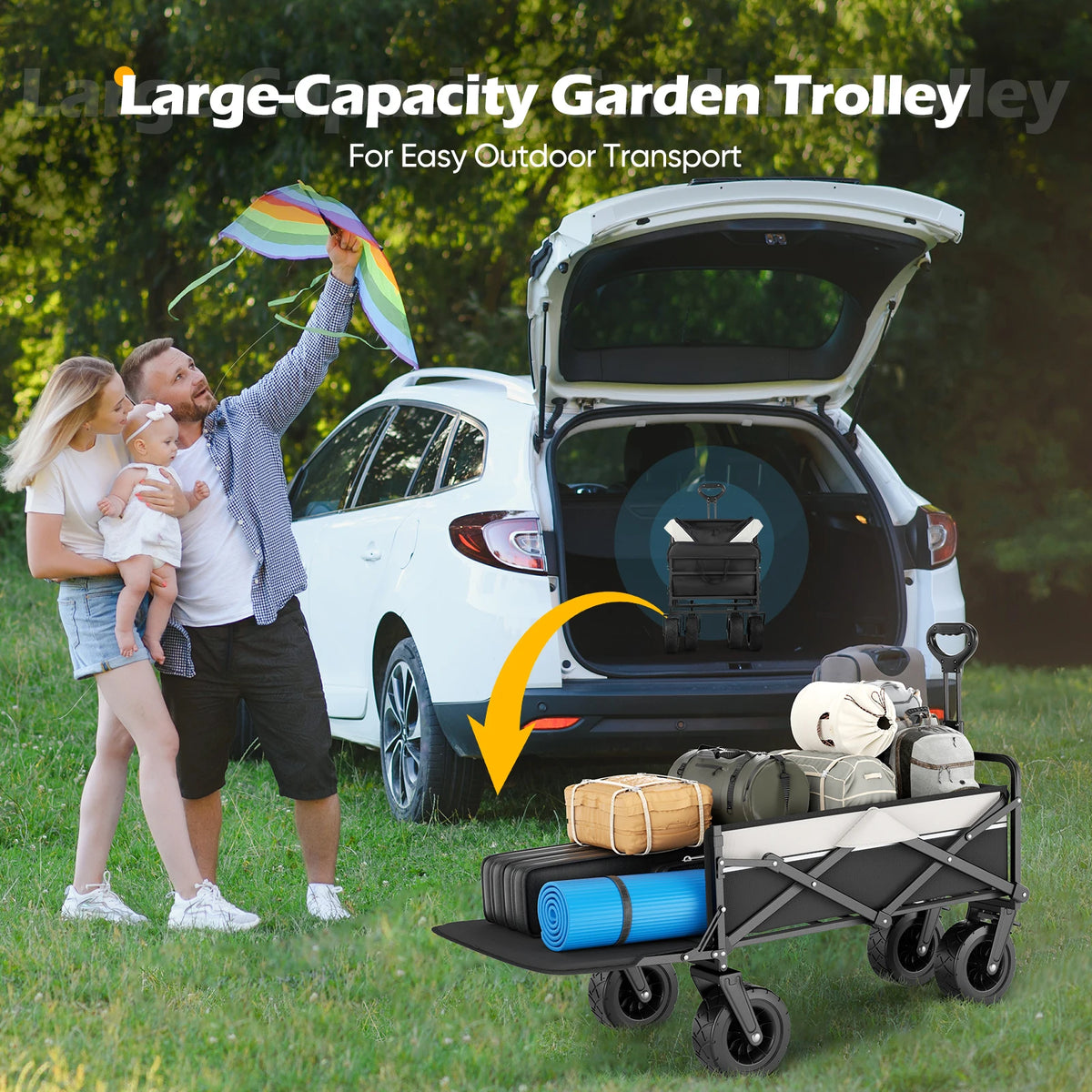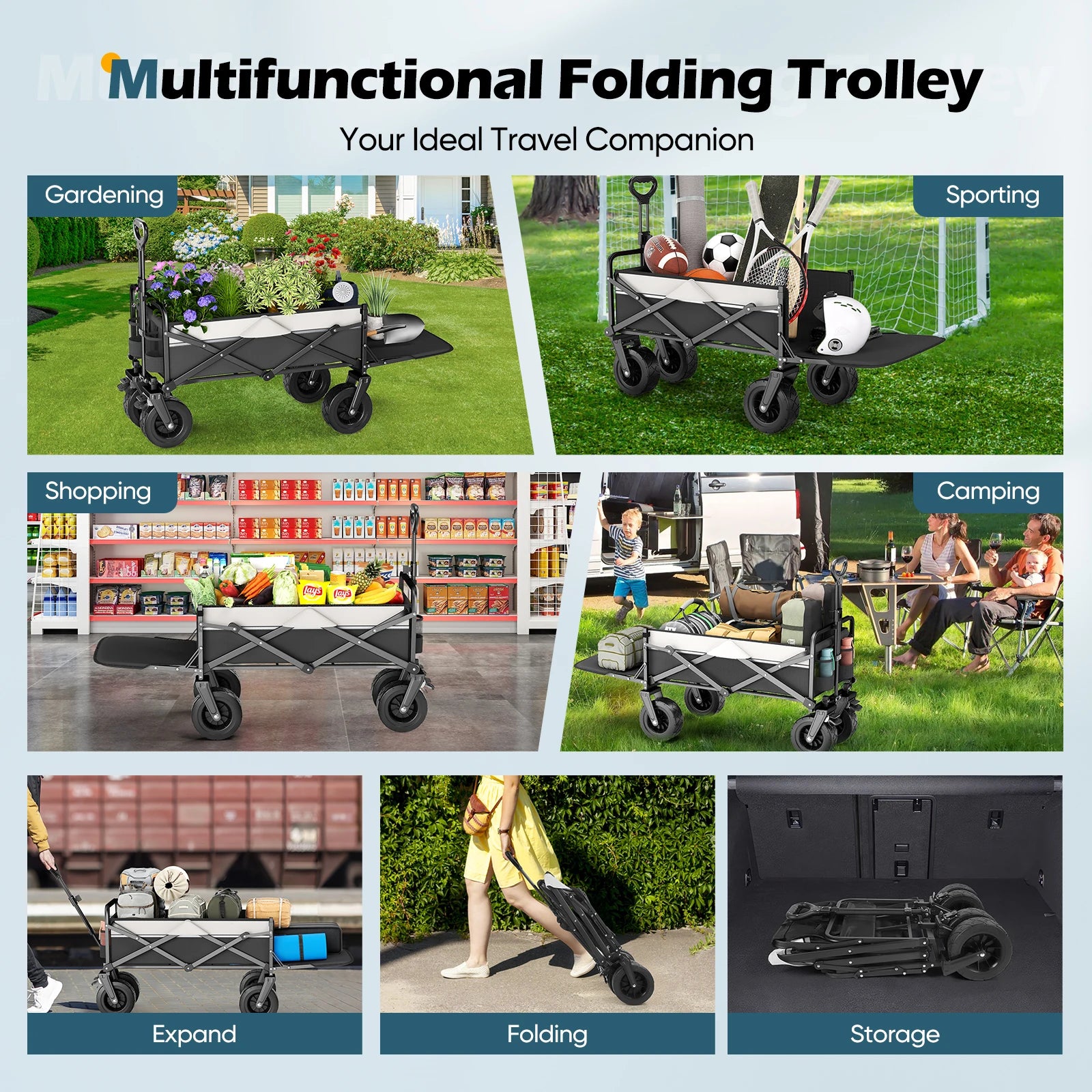 - Design 2 v 1 pro cestování a venkovní použití: složte ho, když je zaparkovaný, a rozložte ho na kempování, nákupy, zahradničení nebo výlety na pláž.