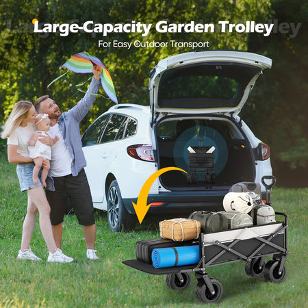 Představujeme skládací vozík na pláž s velkou kapacitou od Jugacool — všestranný kempingový vozík navržený pro těžké náklady a snadnou přepravu. Když potřebujete více místa, otevřete ho během několika sekund a odhalíte prostornou nákladovou plochu o objemu 120L, která snadno pojme kempingové vybavení, potraviny, sportovní náčiní nebo zahradnické potřeby. Když se nepoužívá, jeho rychlo-skládací design usnadňuje skladování v kufru auta, skříni nebo garáži.