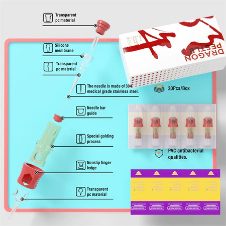 Objevte preciznost a spolehlivost s Dragon Pestle Needles 20Pcs Jednorázové Kazety PMU od JC TATTOO. Tento kombinovaný balíček poskytuje vysoce kvalitní, jednorázové kazety tetovacích jehel navržené pro PMU (permanentní make-up) procedury. Navrženy pro hladký přenos pigmentu a konzistentní práci s liniemi, tyto kazety vám pomohou dosáhnout čistších výsledků při snižování rizika křížové kontaminace mezi klienty. Žádné chemikálie s vysokým rizikem nejsou v těchto kazetách použity, což nabízí spolehlivou volbu pro profesionální práci.
