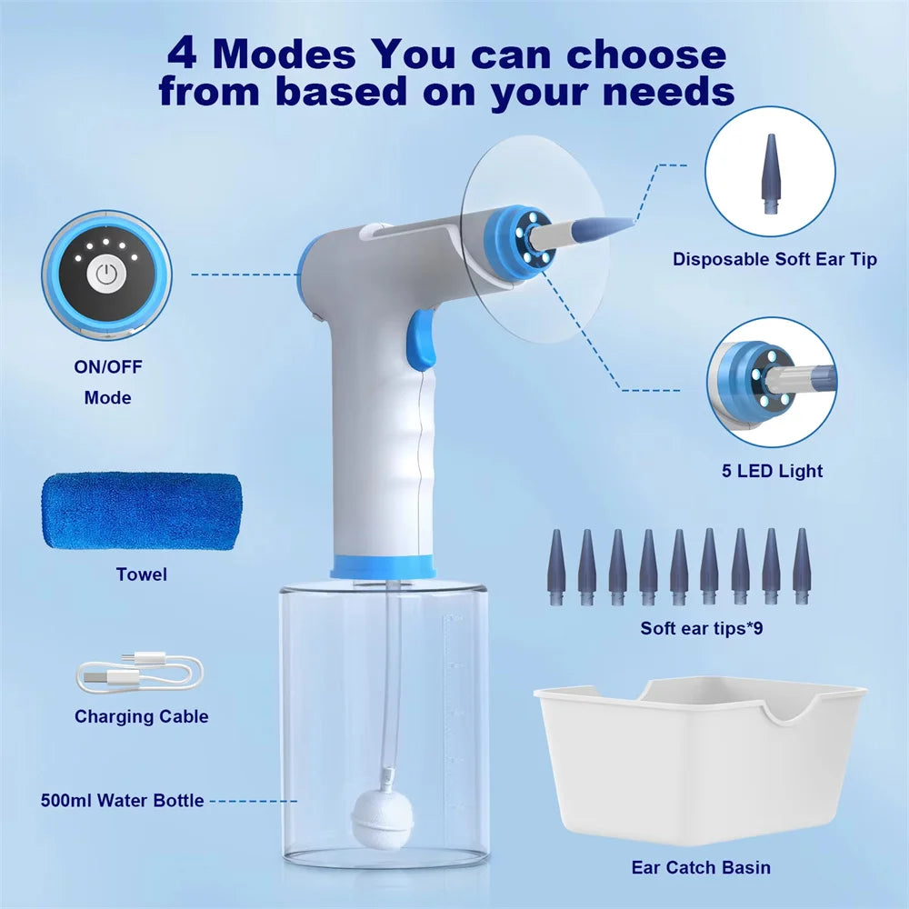 Plně automatický čistič uší čistí vaše uši bezpečným a hygienickým způsobem, bezbolestně a bez vedlejších účinků, a může být používán celou rodinou. Efektivně odstraňuje ušní maz v ušním kanálu, zlepšuje ucpání ušního kanálu, zmírňuje nepohodlí v uších a činí vaše uši pohodlnějšími. Vestavěné funkce, jako jsou 4 samostatné režimy tlaku a značná kapacita vody, zajišťují pohodlný a kontrolovaný zážitek z čištění.