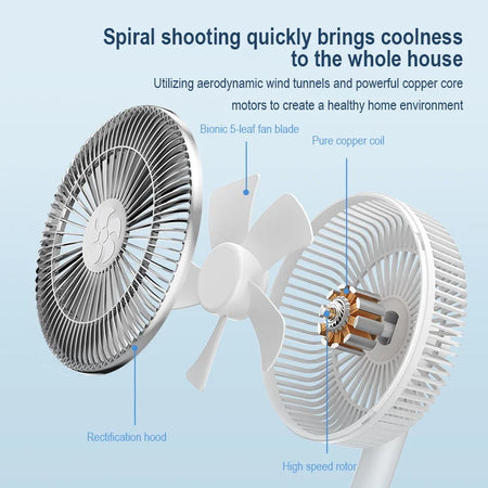 Navržen pro praktické, každodenní použití, ventilátor má spirálový rotor s 5 lopatkami a aerodynamický vzduchový tunel, který vytváří hladký, soustředěný vánek. Hurikánová trubka o průměru 180 mm koncentruje vítr pro dlouhé chlazení, zatímco 90° elevace a 120° naklonění vlevo-vpravo poskytují širokoúhlé dodávání vzduchu bez mrtvých úhlů.
