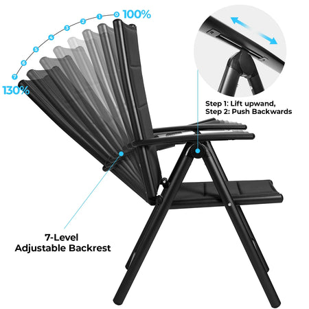 - Ideální pro venkovní stolování, opalování nebo relaxaci s knihou — nastavte opěrku na preferovaný sklon a použijte područky pro pohodlnou podporu.