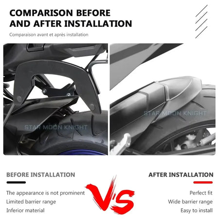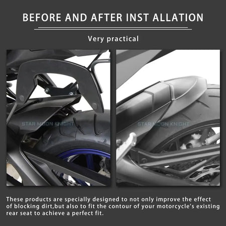 Vylepšete svou Yamahu s prodloužením zadního blatníku MT-09, elegantním zadním rozšířením navrženým k prodloužení vašeho standardního zadního blatníku. Tento praktický doplněk chrání váš motor, chladič, olejový chladič a karoserii před nečistotami, které vyhazuje přední kolo, a pomáhá udržet vaši jízdu čistší a lépe chráněnou za všech povětrnostních podmínek. Vyrobeno z odolného ABS plastu a navrženo tak, aby se bezpečně připevnilo k OEM zadnímu blatníku vašeho motocyklu, toto prodloužení kombinuje jednoduchou instalaci s významnou ochranou.