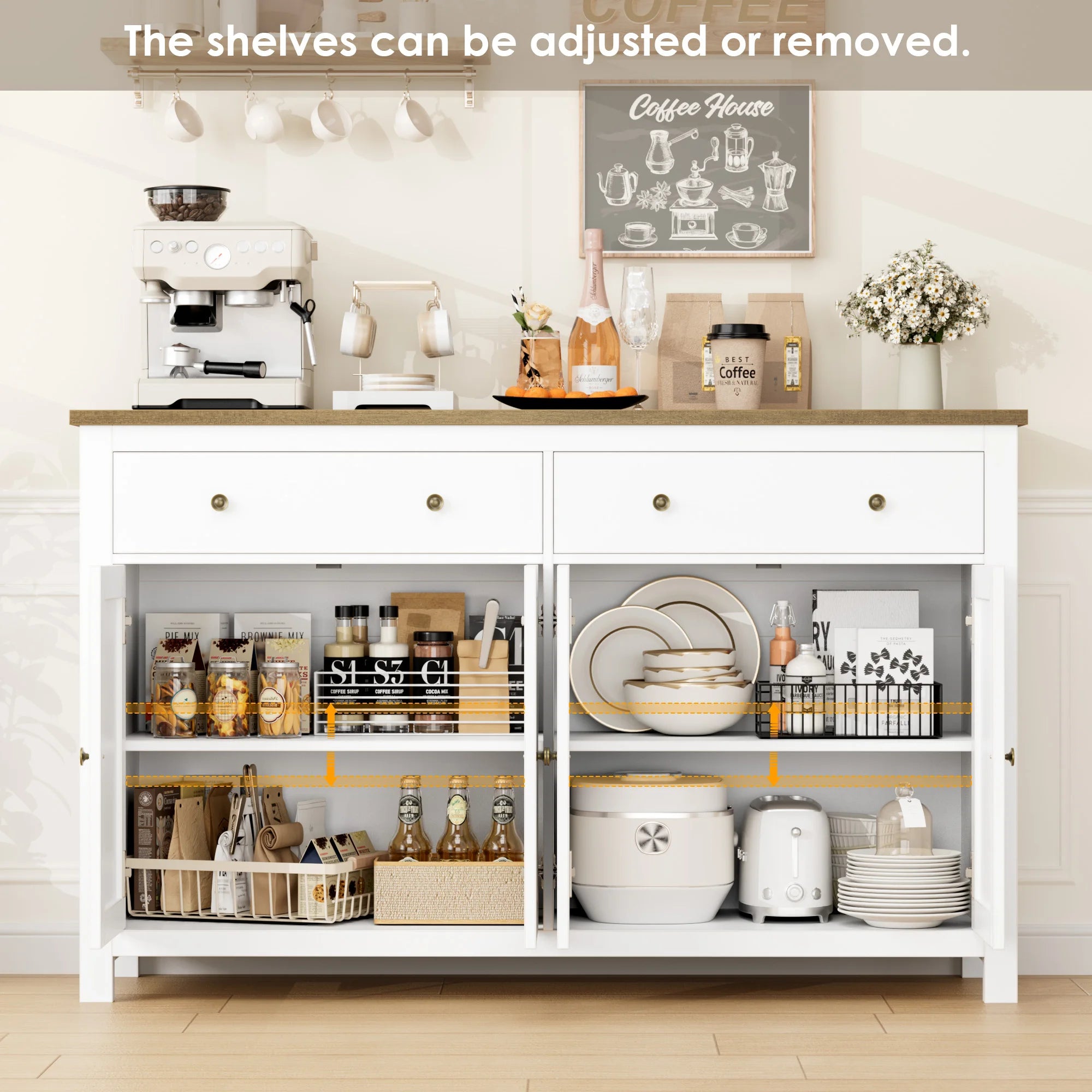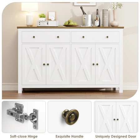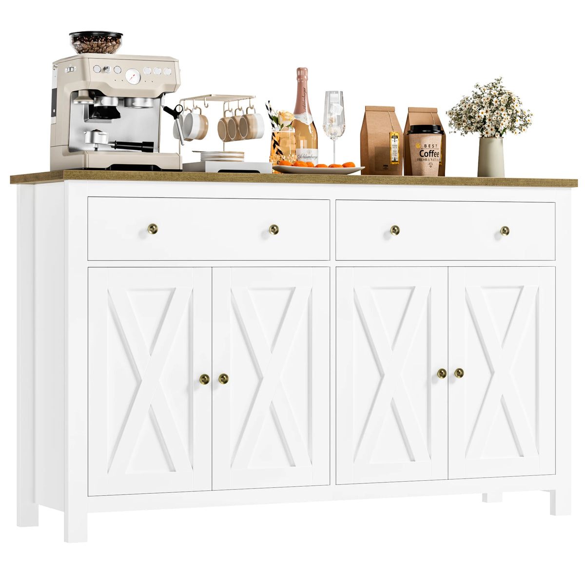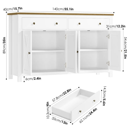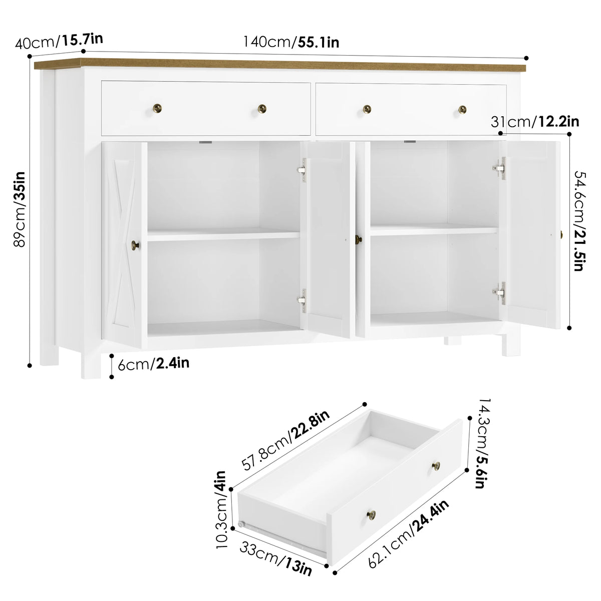 Getone Velký Bílý Komoda kombinuje čisté minimalistické linie s praktickým úložným prostorem, navrženým pro moderní obytné prostory. Měří 140 x 40 x 89 cm, tato všestranná komoda má ostré bílé tělo spárované s dubovou deskou, což vytváří nadčasový, moderní vzhled, který se hodí do jídelních pokojů, obývacích pokojů, kuchyní nebo chodeb. Nabízí dvě velké zásuvky na nezbytnosti jako jsou hrnky a příbory a dvě dvířka s oddíly s nastavitelnými/odnímatelnými policemi, aby se přizpůsobila výška interiéru vašim potřebám. Velkorysá plocha také pojme větší předměty, jako jsou vázy, dekorace, aromaterapeutické difuzéry a dokonce i malé spotřebiče jako kávovary nebo mikrovlnné trouby, což udržuje váš prostor uklizený a organizovaný.