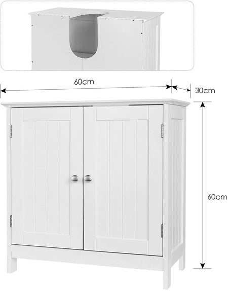 Vylepšete svou koupelnu s bílou skříňkou pod šatníkem Getone. O velikosti 60x30x60 cm, tato bílá koupelnová skříňka spojuje moderní, čistý vzhled s praktickým designem šetřícím prostorem. Dveře a strany jsou vyrobeny z dřevěných panelů a natřeny na bílo pro odolný, nadčasový povrch, který se hodí do jakékoli moderní koupelny.