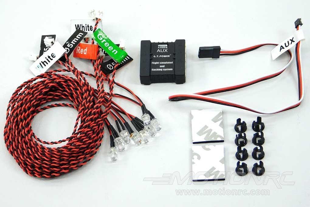 Vytvořte poutavé noční představení s Navigačním osvětlením letadla. Tento komplexní LED systém od GT Power je navržen pro modely letadel do velikosti .60. Osvětlete oblohu kombinací 2 bílých stálých žárovek, 1 zelené stálé žárovky, 1 červené stálé žárovky, 2 bílých stroboskopických žárovek a 2 červených pomalu blikajících žárovek.
