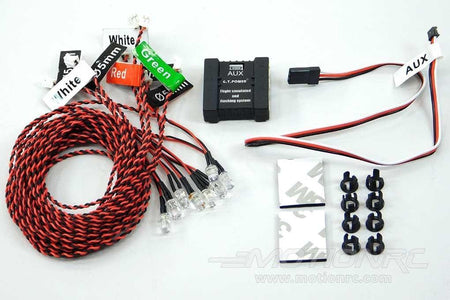 Balení obsahuje vše potřebné k instalaci: 8 jasných LED světel, řídicí desku s napájecím kabelem, svorky pro upevnění LED diod a oboustrannou pásku pro montáž řídicí desky uvnitř trupu. Samec JR konektor na řídicí desce umožňuje snadné připojení k libovolnému volnému kanálu na vašem přijímači.