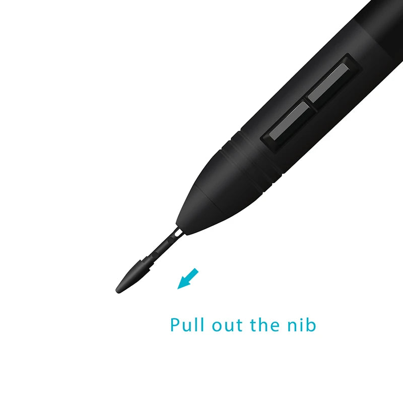 - Rychle a snadno vyměňte opotřebované hroty: použijte nástroj na odstranění (součástí balení s Huion tablety) k vytažení starého hrotu, vložte nový hrot a zatlačte, dokud neuslyšíte lehké cvaknutí.