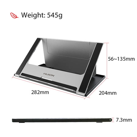Vylepšete své pracovní místo s nastavitelným skládacím stojanem Huion ST200, lehkým, ale robustním hliníkovým držákem navrženým pro notebooky, tablety a světelné podložky o velikosti 10-15,6 palce. Víceúhlový design vám umožňuje umístit obrazovku mezi 14,5° a 45° pro pohodlný zážitek z prohlížení, čímž se snižuje napětí v krku, ramenou a zádech během dlouhých kreslicích sezení nebo psacích úkolů. Až budete hotovi, jednoduše složte stojan na štíhlých 7,6 mm a vložte ho do tašky pro snadné použití na cestách.