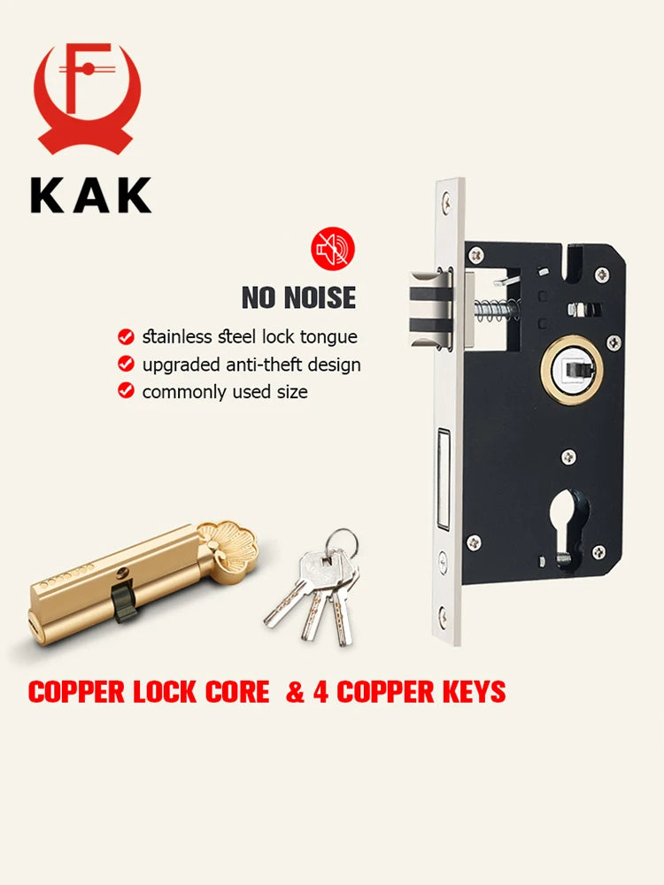 Vylepšete svůj vstup s KAK evropským zlatým zámkem na dveře s klíči. Tento vysoce kvalitní zámek spojuje klasický evropský design s spolehlivou bezpečností, vyrobený z odolné zinkové slitiny pro dlouhotrvající výkon. Hodí se na dveře o tloušťce 35–45 mm a funguje jak s dveřmi otevírajícími se vlevo, tak vpravo, což z něj činí univerzální volbu pro jakýkoli vstup. Hladký, tichý provoz zajišťuje bezpečný pocit bez rušivého hluku a získáte klid s třemi pevnými měděnými klíči v ceně. K dispozici ve zlaté a několika barevných variantách (bílá jantarová, červená jantarová, bílá, zlatá, černá jantarová), tento zámek dodává vašim dveřím nádech rafinovaného stylu. Vzdálenost od středu k středu klíčové dírky je 50 mm pro jisté zarovnání se standardními dveřmi.