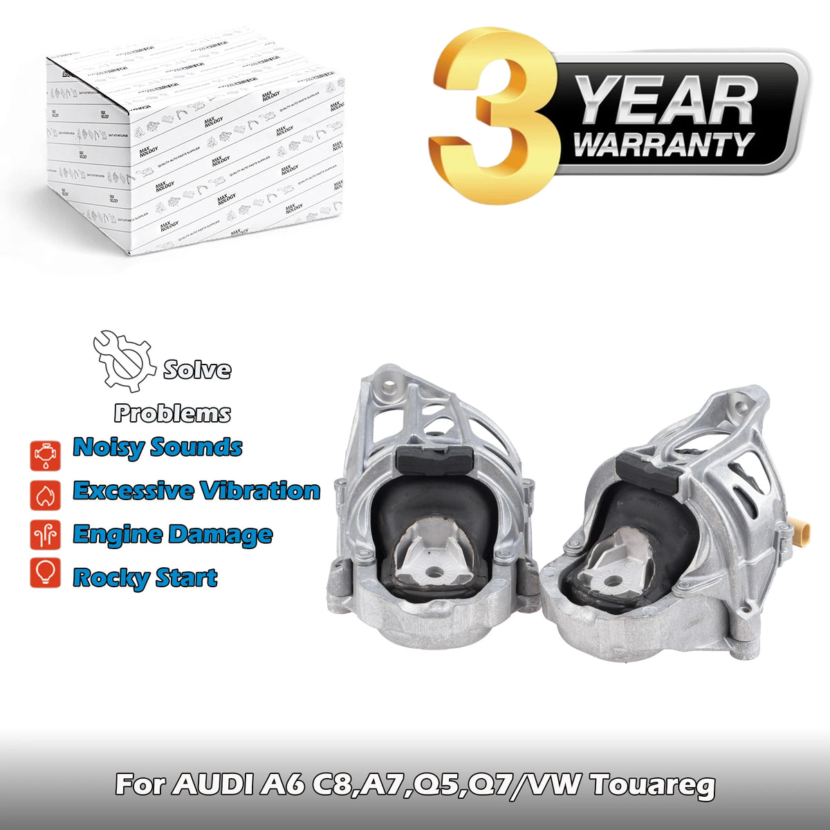 Audi A6 C8, A7, Q5, Q7, VW Touareg motorové držáky vlevo a vpravo se senzorem od MAX NOLOGY. Tyto motorové držáky vlevo a vpravo jsou navrženy pro aplikace Audi A6 C8, A7, Q5, Q7 a VW Touareg, poskytující přesné uchycení a spolehlivý výkon. Držáky kombinují robustní konstrukci z gumy a kovu s elektricky nastavitelným hydro designem a integrovaným senzorem, s cílem snížit pohyb motoru, tlumit vibrace a udržovat optimální zarovnání za dynamických jízdních podmínek.