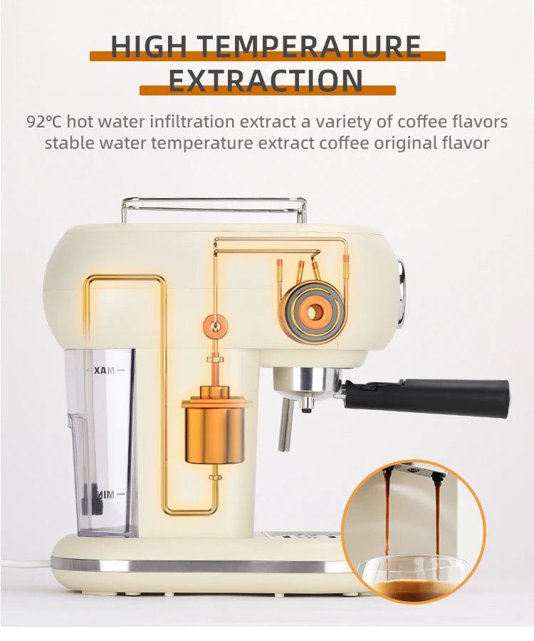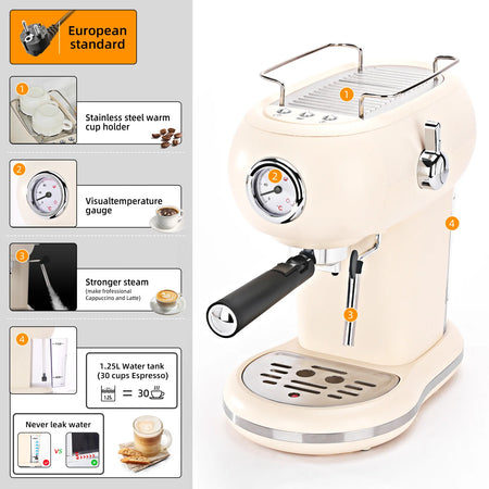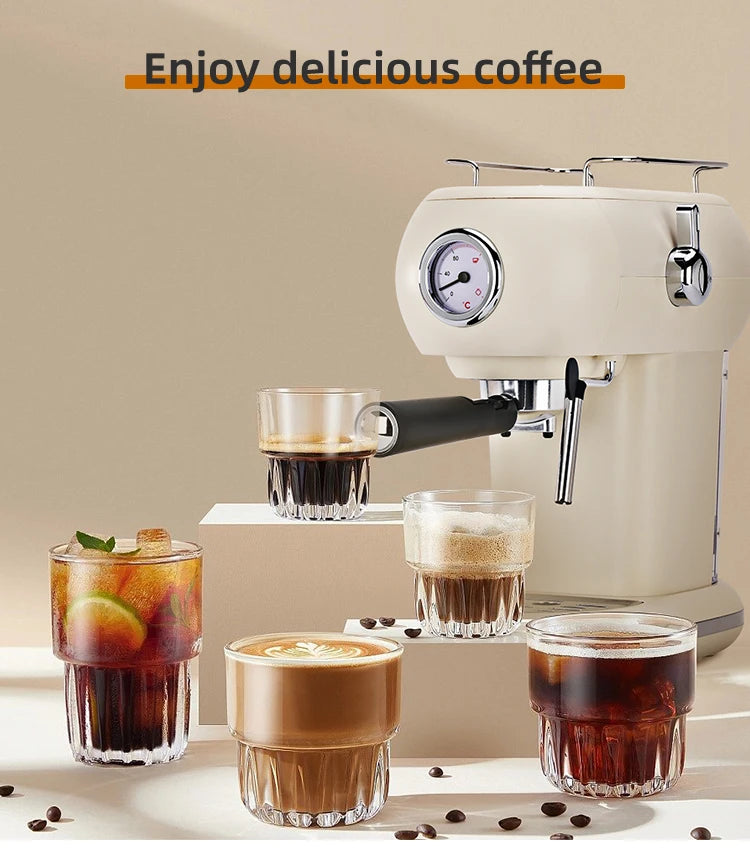 Seznamte se s kávovarem MCILPOOG 19 Bar Semi Automatic Espresso Machine With Steamer, kompaktním výrobníkem latte navrženým pro domácí baristy, kteří touží po kávě kvalitě kavárny, aniž by opustili kuchyni. V elegantním béžovém provedení tento stroj kombinuje 19-barový extrakční systém s vestavěnou parní tryskou, aby poskytl bohatou cremu a sametovou mléčnou pěnu. S 1,25l nádrží na vodu a schopností připravit více než 16 šálků na jedno naplnění je ideální pro rušná rána nebo malé shromáždění. Lehká plastová konstrukce usnadňuje manipulaci, zatímco jeho výkon 220-230V, >299W zajišťuje rychlé zahřátí a efektivní výkon. Tento poloautomatický přístroj vám dává kontrolu nad mletím, tampováním a texturou mléka pro skutečně personalizované espresso. Všechna elektronická a mechanická zařízení, přístroje a stroje prodávané společností InterCyprus do zemí EU jsou certifikována CE a mají dvouletou záruku. Poskytujeme kvalitní a důvěryhodné služby od roku 2002 na intercyprus.com.