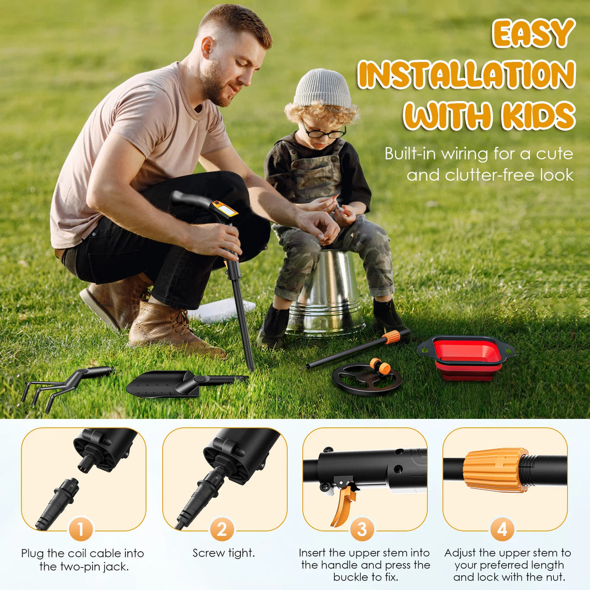 Snadné nastavení a obsluha jsou hračkou díky ovládání jedním tlačítkem a třem jednoduchým krokům montáže. Balení obsahuje dětem přátelské příslušenství—lopatku, hrábě a síto—takže dychtiví objevitelé mohou kopat, prosévat a objevovat poklady s radostí.