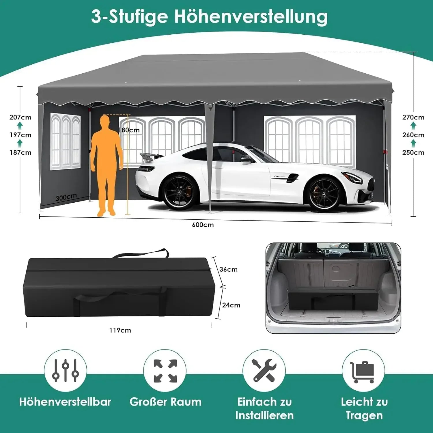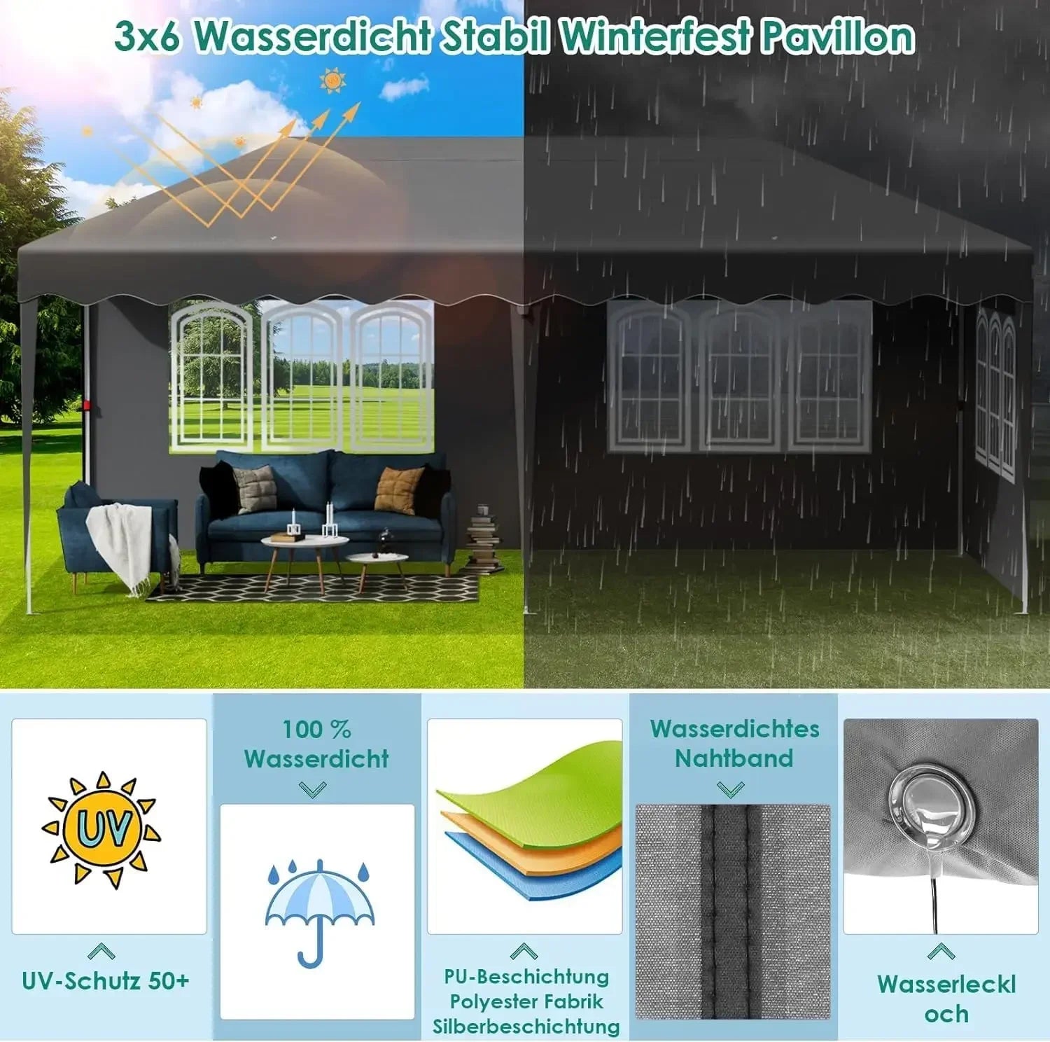 S velkorysou plochou 3x6 metrů máte dostatek místa pro hosty, výstavní stoly nebo odpočinkové zóny. Čtyři boční panely nabízejí soukromí a stín, když je to potřeba, a průhledná okna na všech stranách zajišťují dobrý průtok vzduchu a jasný, otevřený pocit. Horní kryt používá zpevněnou stříbrně potaženou tkaninu 420D Oxford s PU povlakem pro výjimečné voděodolné vlastnosti, ochranu proti slunci UPF50+, lepené švy a odtokové otvory pro odvádění dešťové vody. Výsledkem je přístřešek, který vás udrží v suchu, pohodlí a chrání před sluncem během venkovních akcí.