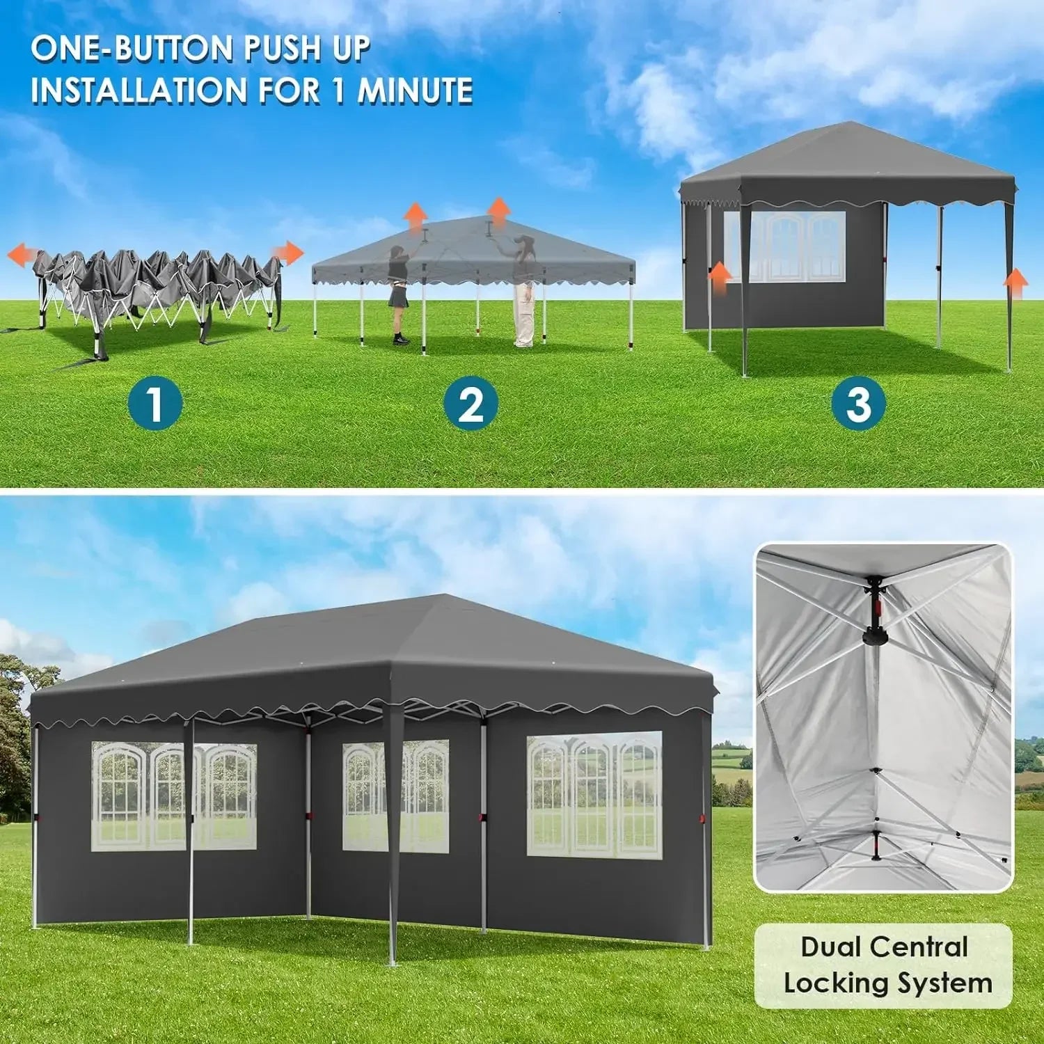 Seznamte se s altánem One Push Folding Gazebo 3x6m Voděodolný 4 Strany Pavilon—univerzální venkovní přístřešek navržený pro shromáždění, trhy, pláže, svatby a kempování. S rychlým, beznástrojovým centrálním push/pop-up designem a bezpečným centrálním zámkem, tento pavilon přechází z balení do montáže během několika minut, což vám poskytuje spolehlivý stíněný prostor, kdekoliv ho potřebujete. Odolný rám z hliníkové slitiny poskytuje pevnou podporu, zatímco zůstává lehký pro snadnou přepravu.