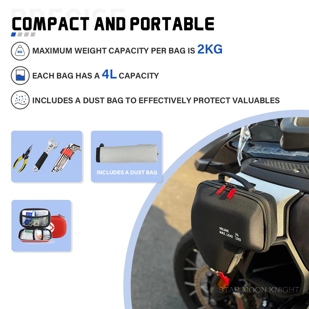 Navrženo pro BMW R 1300 GS Adventure 2024+ a prodáváno jako sada pro levou a pravou stranu, tyto tašky na chladič z nylonu přidávají praktické, na počasí připravené úložiště přesně tam, kde je potřebujete. Tašky se připevňují přímo na chladič pomocí tří háčků—bez potřeby popruhu—takže můžete rychle a bezpečně zajistit malé předměty. Spodní část si udržuje svůj tvar pro snadné nakládání, zatímco víko z EVA plastu poskytuje pevný, ochranný vršek. Vodotěsná vnitřní taška zajišťuje, že vaše nezbytnosti zůstanou suché, a vnější materiál je odolný proti trhání, UV- a povětrnostním vlivům, což činí tyto tašky odolné pro každodenní jízdu a drsné podmínky. Klasické černé provedení se mísí s vzhledem motocyklu a zároveň poskytuje spolehlivé, snadno přístupné úložiště na každé jízdě.