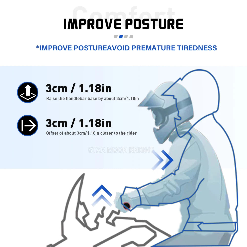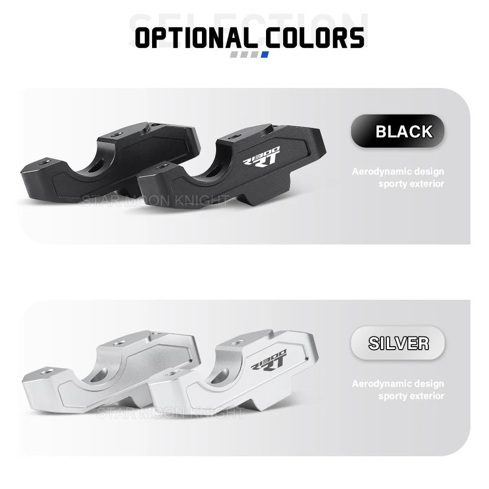 Vylepšete svůj BMW R1300GS, Adventure a R1300RT s držákem řídítek Star Moon Knight – offsetním hliníkovým adaptérem, který zvedá vaše řídítka o 3 cm (1,18 in) pro pohodlnější a kontrolovanější jízdní pozici. Toto jednoduché vylepšení přibližuje kokpit k vašemu tělu, zkracuje dosah při sezení a zlepšuje páku při stání pro přímější spojení s předním kolem. CNC frézovaný a anodizovaný pro trvanlivost, držák je specifický pro vozidlo, snadno se instaluje a nevyžaduje žádné úpravy vašeho motocyklu.