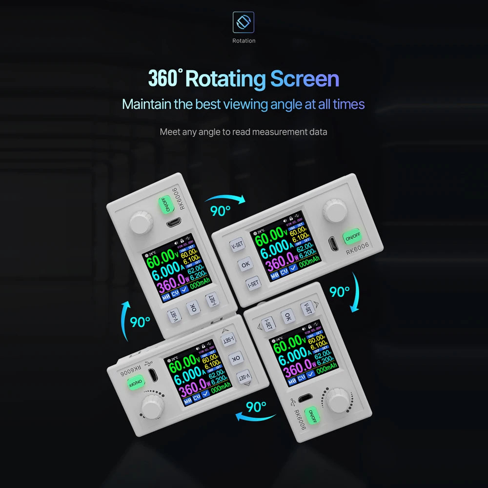 Seznamte se s RK6006 DC regulovaným napájecím zdrojem, kompaktním bench-power zdrojem určeným pro elektronické projekty, laboratorní práci a výrobní testování. Dodává přesné výstupní napětí 0–60,00 V a až 6,000 A, poskytuje až 360 W stabilního výkonu pro napájení zátěží, jako jsou vysoce výkonné LED diody, CNC řídicí jednotky a testovací zařízení. 1,54palcový LCD displej (240×240) nabízí jasné, přesné údaje s nastavitelným jasem a 360stupňovou rotací pro snadné sledování z jakéhokoli úhlu. Vyberte si mezi RK6006 (USB ovládání) a RK6006-BT (USB + Bluetooth ovládání), aby vyhovoval vašemu pracovnímu postupu a preferencím připojení.