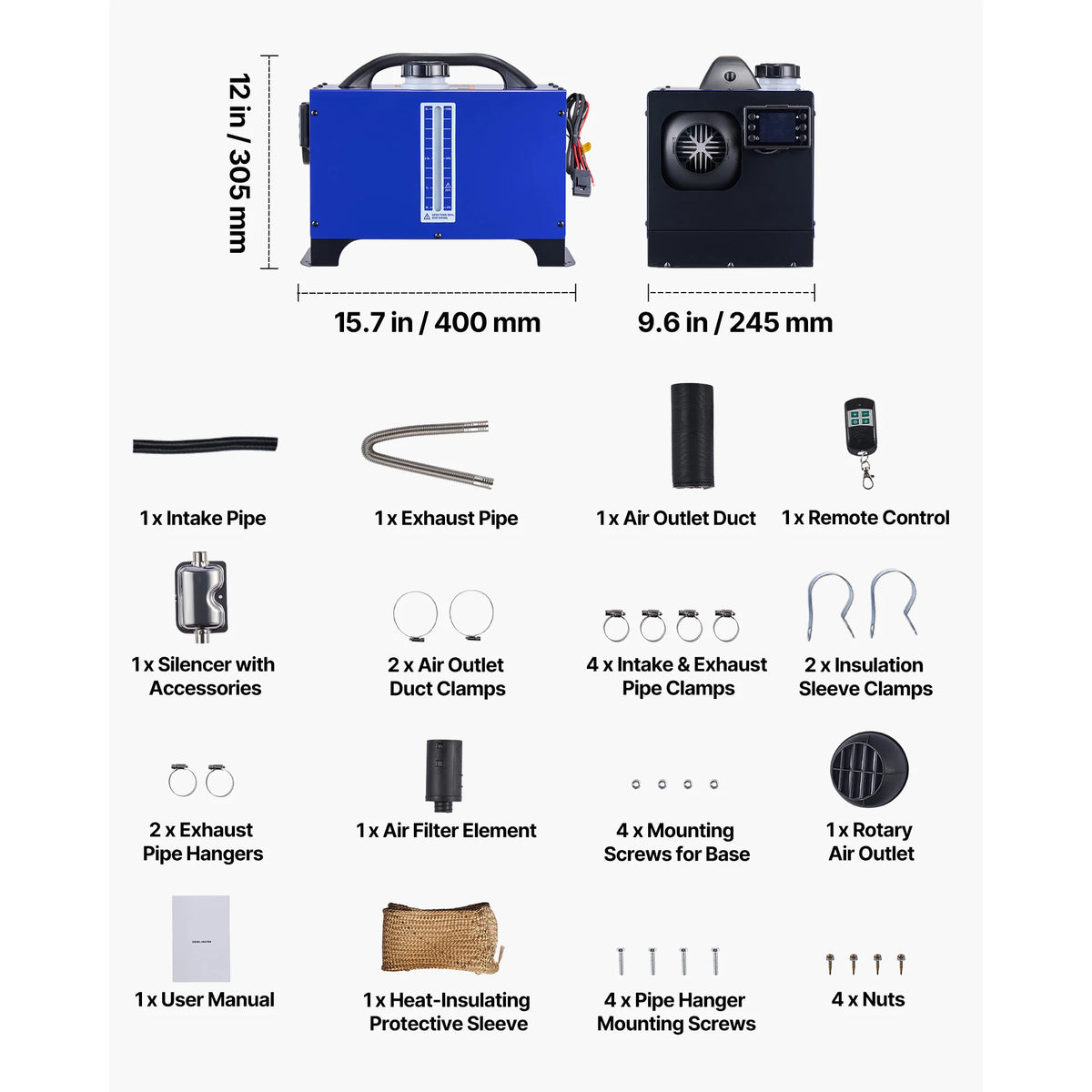 Seznamte se s 8KW Diesel Heater DC 12V/24V — kompaktní, vysoce účinné topení navržené tak, aby udržovalo vaši kabinu rychle teplou. Dodávající 8KW tepla, toto topení zvyšuje vnitřní teploty během několika minut, takže si můžete užívat pohodlný prostor i za mrazivých podmínek. Univerzální pro obytné vozy, nákladní automobily, SUV, dodávky, stany a garáže, přizpůsobuje se napájecímu systému vašeho vozidla (DC 12V nebo 24V) pro spolehlivé teplo na cestách.