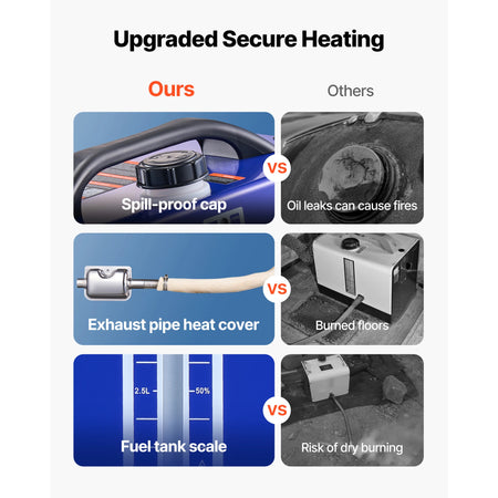 Účinný, tichý provoz — tichá, energeticky úsporná palivová pumpa udržuje spotřebu paliva nízkou s odhadovaným spalováním 0.04–0.1 gal/h a více než 90% účinností. Palivová nádrž o objemu 1.3 galonu podporuje celonoční topení, snižuje potřebu doplňování paliva a plýtvání energií.