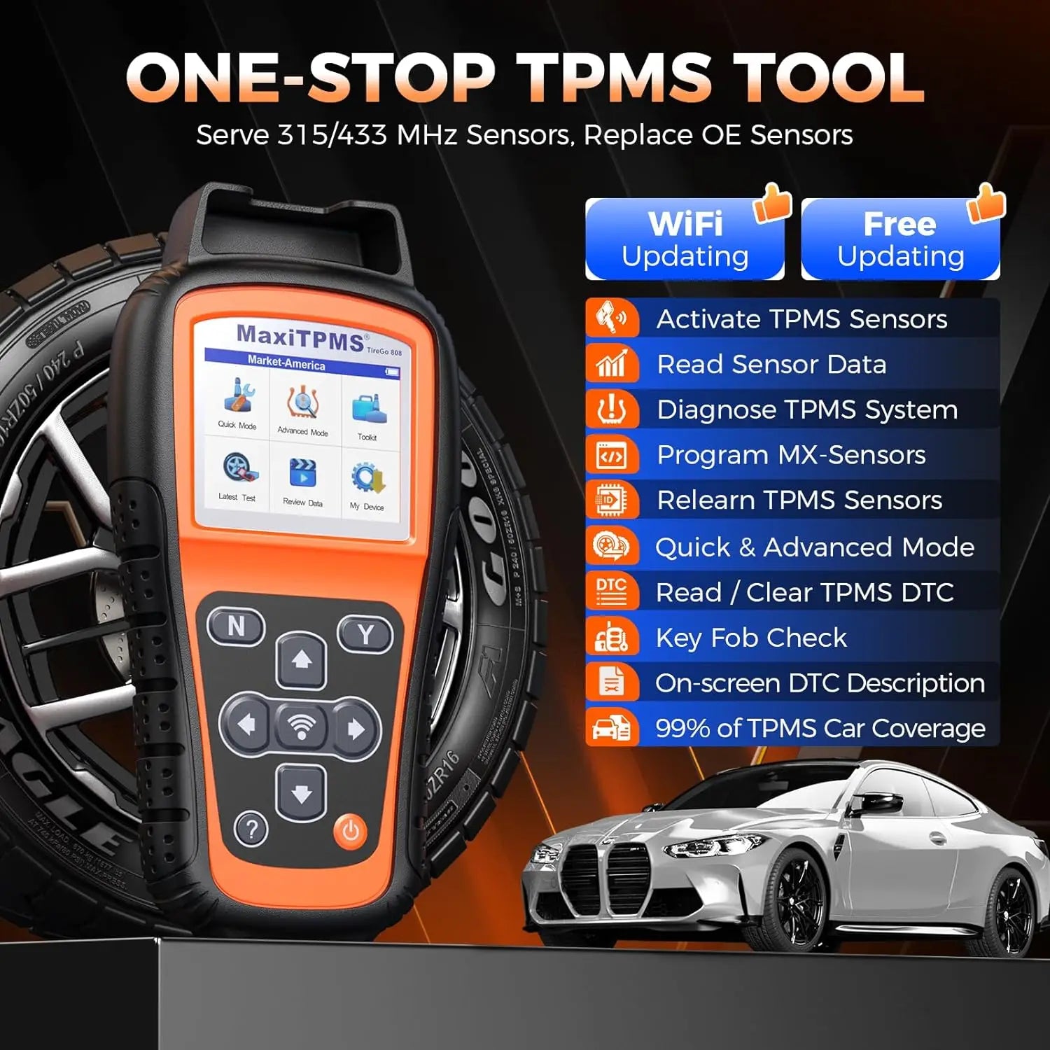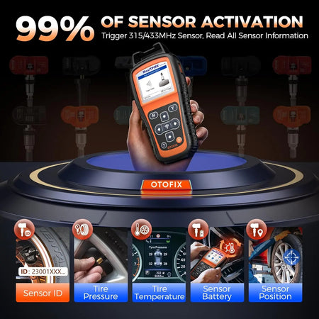 OTOFIX TireGo 808 TPMS Relearn Tool pro všechny senzory, 315/433MHz MX Sensor je všestranný nástroj pro programování a opětovné učení TPMS navržený tak, aby zjednodušil údržbu systému monitorování tlaku v pneumatikách. Ať už jste nadšenec do DIY nebo profesionální technik, tento nástroj urychluje programování TPMS, opětovné učení senzorů, aktivaci a diagnostiku s lehkostí. Podporuje 315/433MHz MX senzory a je navržen pro rychlý a spolehlivý výkon napříč širokým spektrem vozidel. S doživotními aktualizacemi softwaru zůstáváte v obraze s vyvíjející se technologií TPMS bez dalších nákladů.