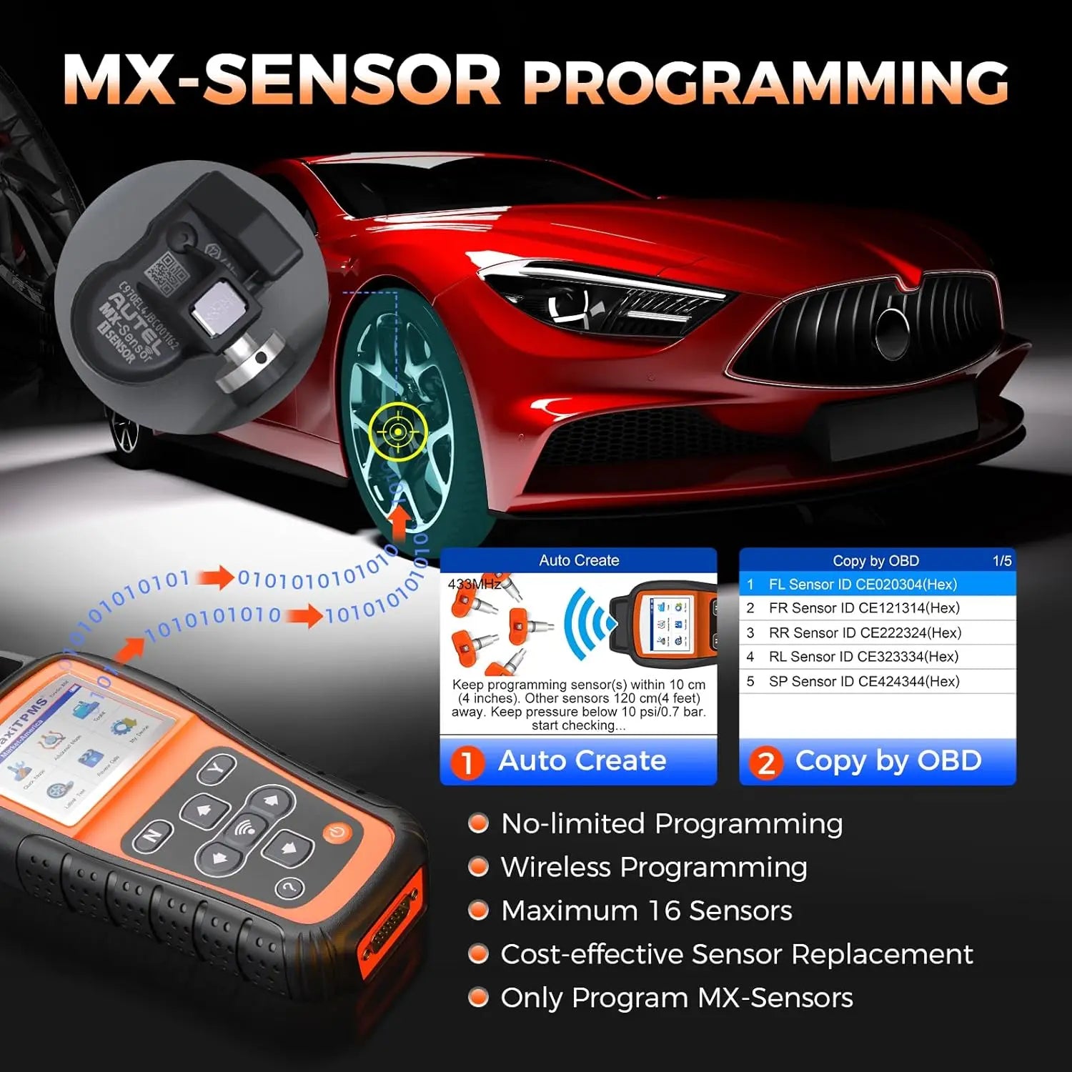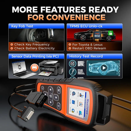 Hlavní funkce zahrnují kontroly zdraví TPMS, programování senzorů, opětovné učení/aktivaci a komplexní přehled dat s možnostmi tisku. Budete mít čtyři přístupy k programování—Kopírovat podle aktivace, Kopírovat podle ručního zadání, Auto Create (naprogramujte 1-16 MX-senzorů během několika sekund) a Kopírovat přes OBD (není vyžadováno opětovné učení)—vše navrženo tak, aby výměna senzorů byla rychlá a jednoduchá. Po instalaci nových senzorů můžete opětovně učit třemi způsoby—OBD Relearn, Automatické Relearn nebo Stacionární Relearn—takže můžete přesně zkopírovat ID senzorů do ECU vozidla a zajistit spolehlivý provoz TPMS.