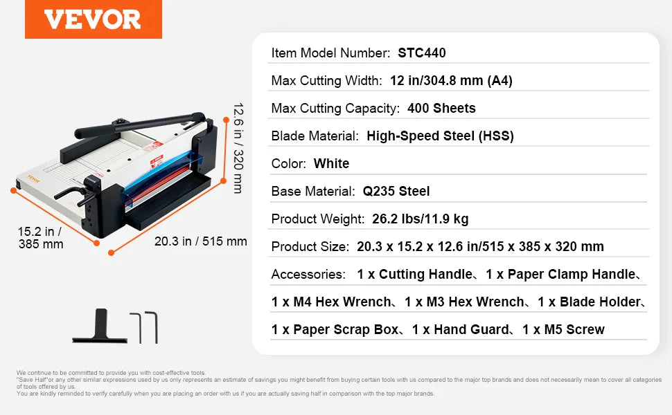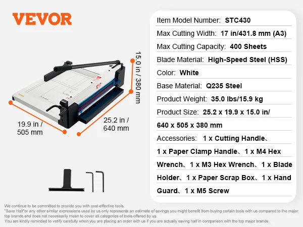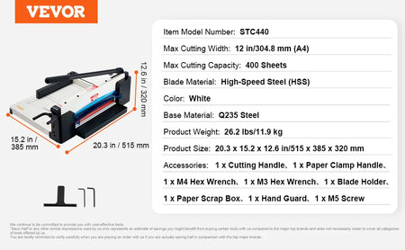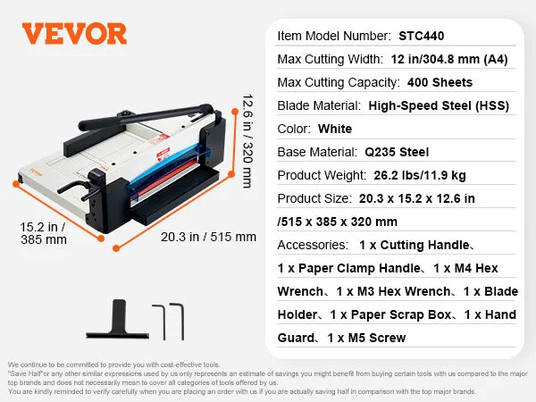 Seznamte se s VEVOR Řezacím strojem na papír, těžkým řezacím řešením navrženým pro precizní zvládání velkých úloh. Tento model nabízí rozsah řezu od 12 do 17 palců a dokáže proříznout až 400 listů na jeden průchod, což usnadňuje hromadné řezání pro kanceláře, tiskárny, školy a studia. Ideální pro ořezávání papíru, fotografií a karet, poskytuje čisté, přesné řezy s minimálním úsilím – zvyšuje produktivitu a snižuje odpad.