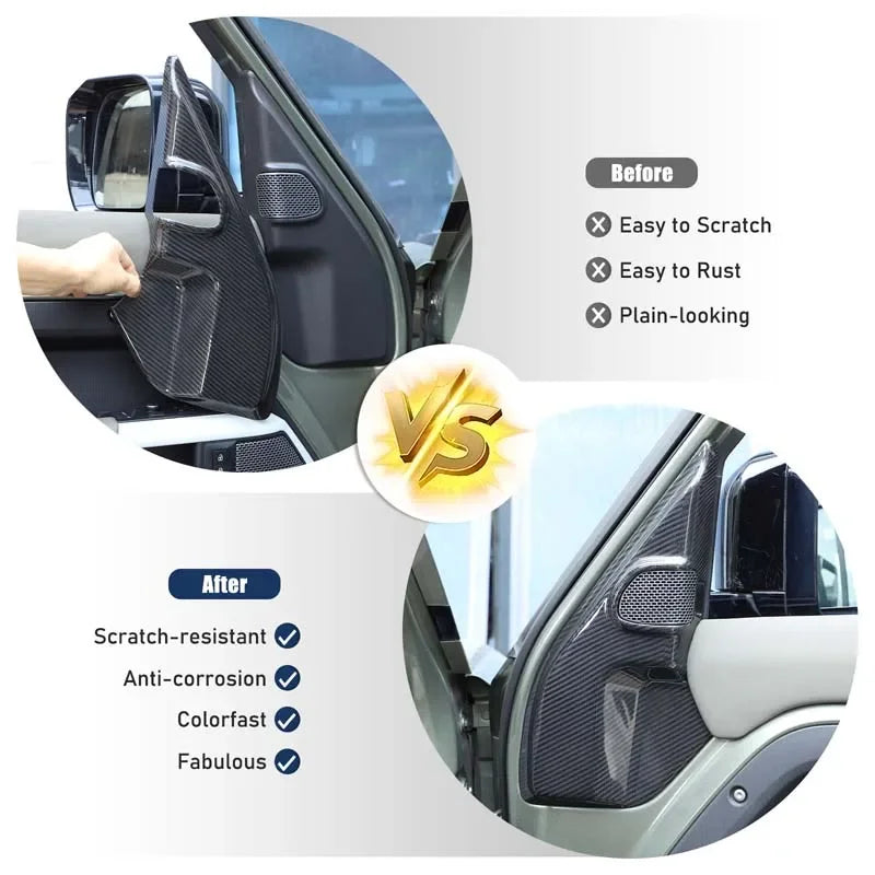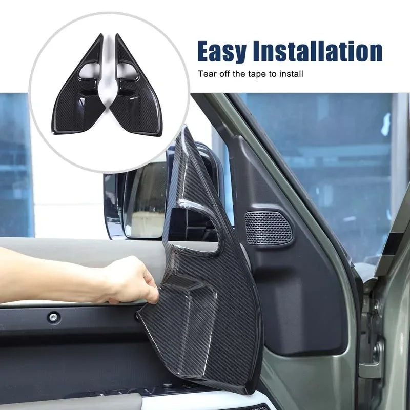 Opgrader dit Land Rover Defender interiør med dette 2-delte Carbon Fiber A-stolpe horn cover sæt. Designet til Defender 90, 110 og 130 modeller fra 2020 og frem, giver disse A-stolpe covers et premium, sportsinspireret look samtidig med at hornområdet beskyttes mod ridser og daglig slitage. Fremstillet af ægte carbon fiber og færdiggjort i autentisk carbon fiber farve, installeres de nemt med den dobbeltsidede bilklæbende tape på bagsiden, ingen boring nødvendig. Fremstillet på en ISO9001-certificeret fabrik i det kinesiske fastland, kombinerer dette splinternye tilbehør holdbarhed med stil for en raffineret Defender kabine.