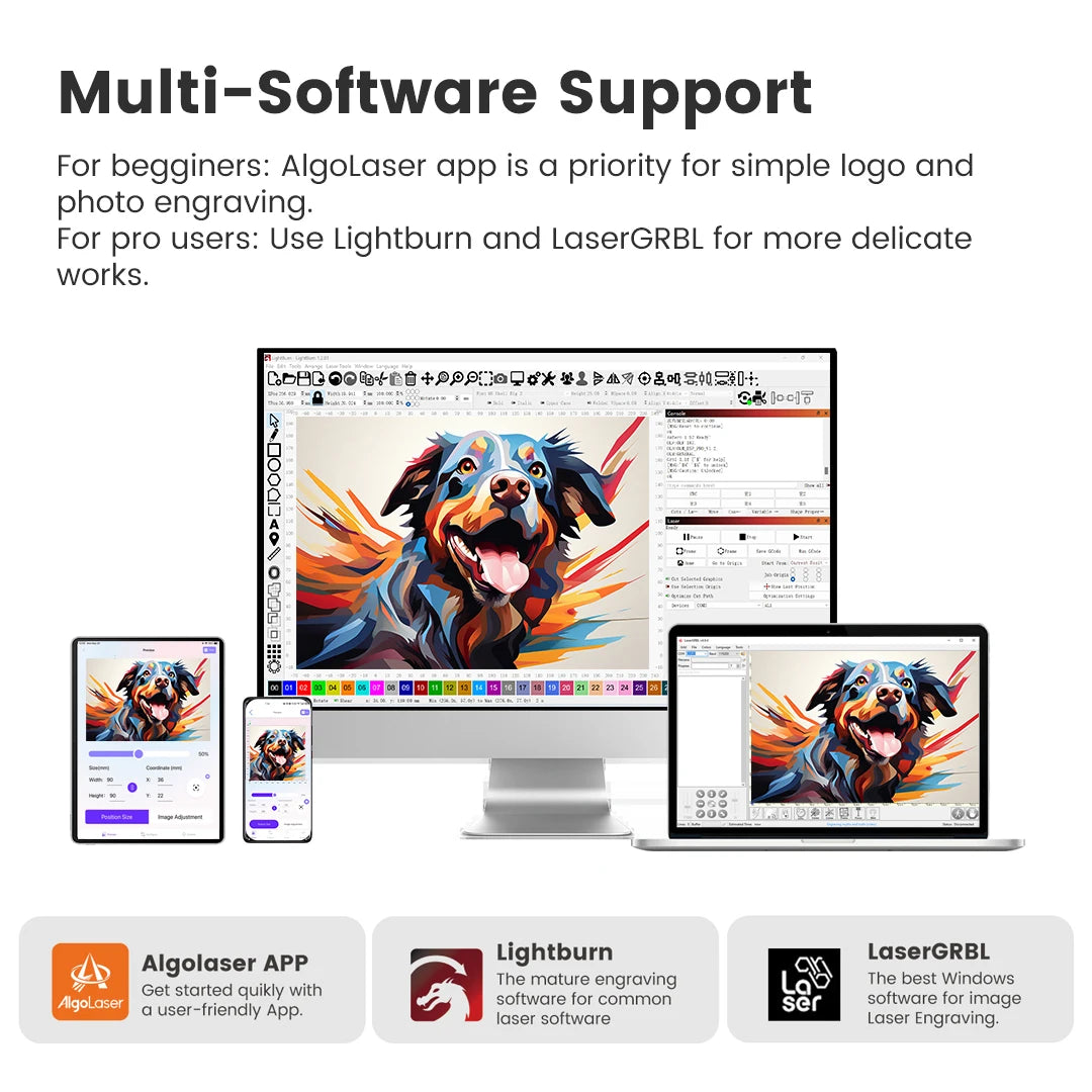 - Kontrolsoftware: LightBurn, LaserGRBL, Algolaser APP
