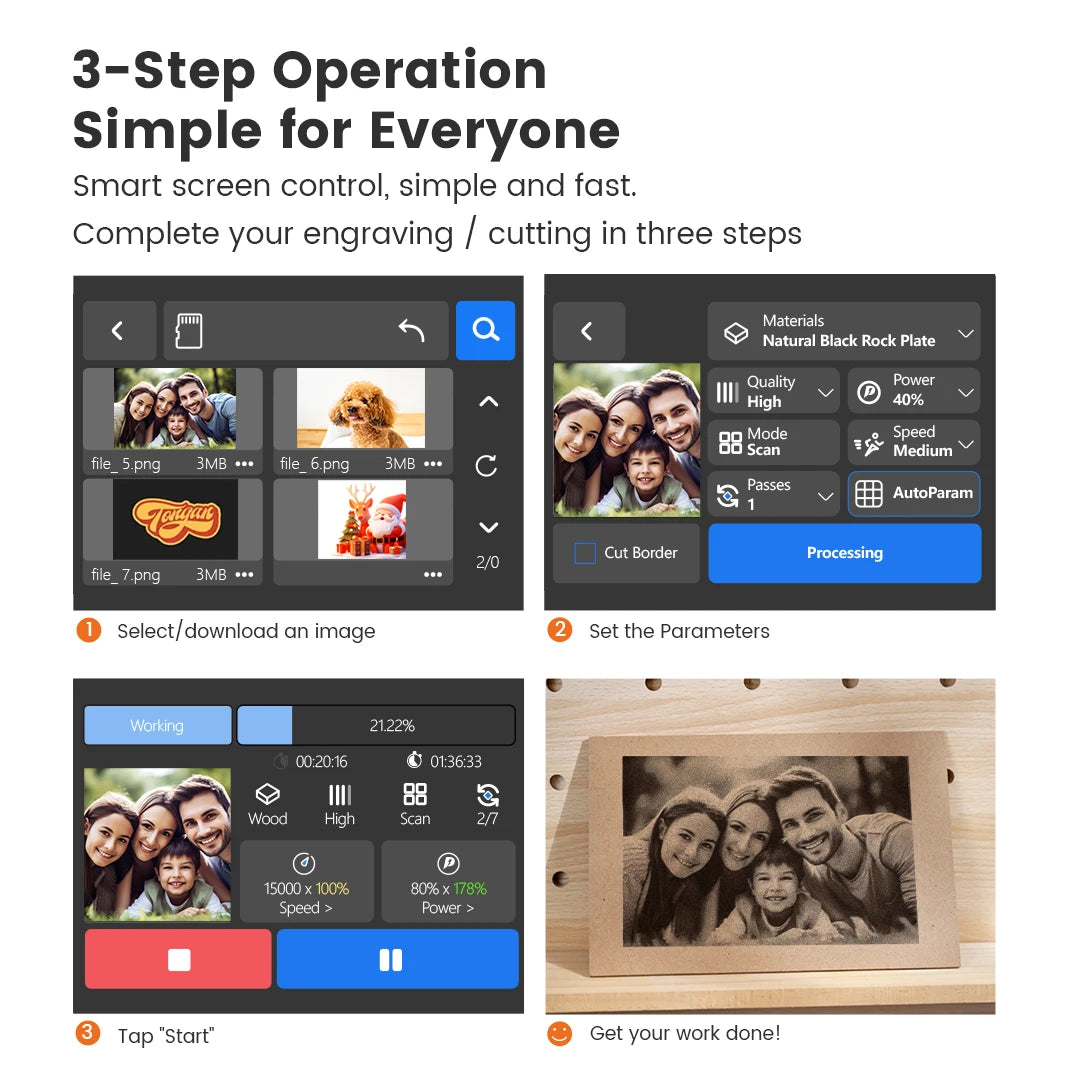 Designet til praktisk daglig brug, kombinerer Alpha MK2 offline kapabilitet med kraftfuld forbindelse. Den understøtter offline drift via TF-kort og USB, plus trådløs kontrol gennem WiFi (2.4G) og en dedikeret app, så du kan starte opgaver fra dit foretrukne workflow. Systemet er kompatibelt med LightBurn, LaserGRBL og den Algolaser-udviklede APP, og fungerer med Windows og Mac-platforme for at passe perfekt til dit setup. En højtydende 30 L/min luftassistentpumpe holder overfladerne rene og linserne køligere for længere levetid og skarpere resultater.