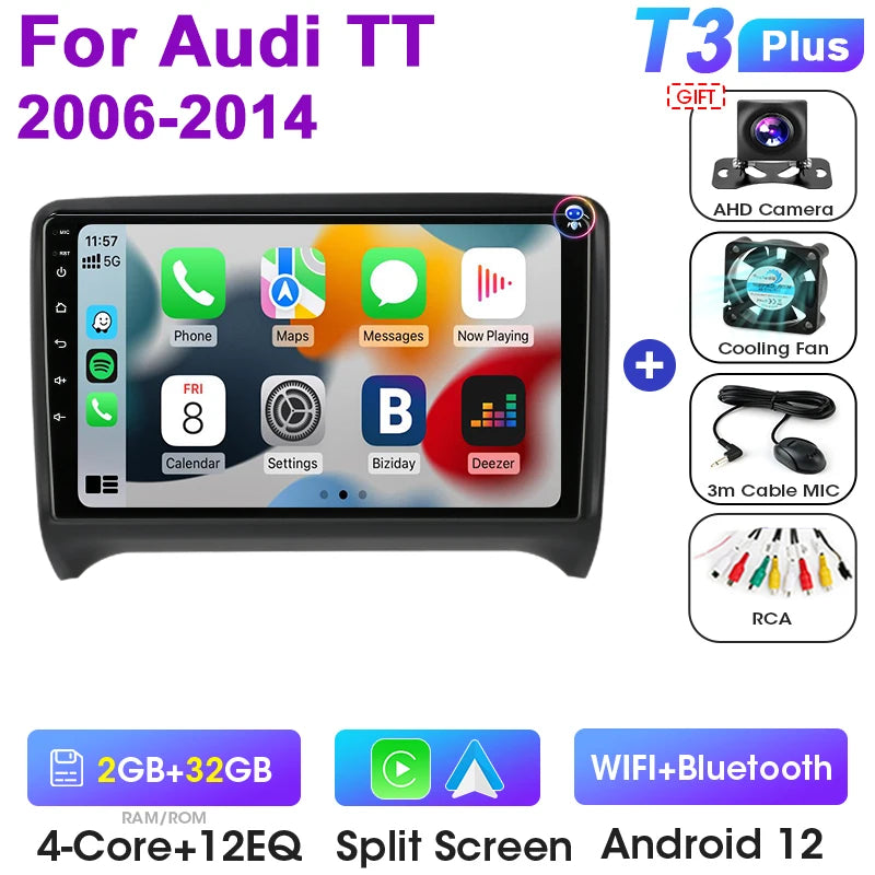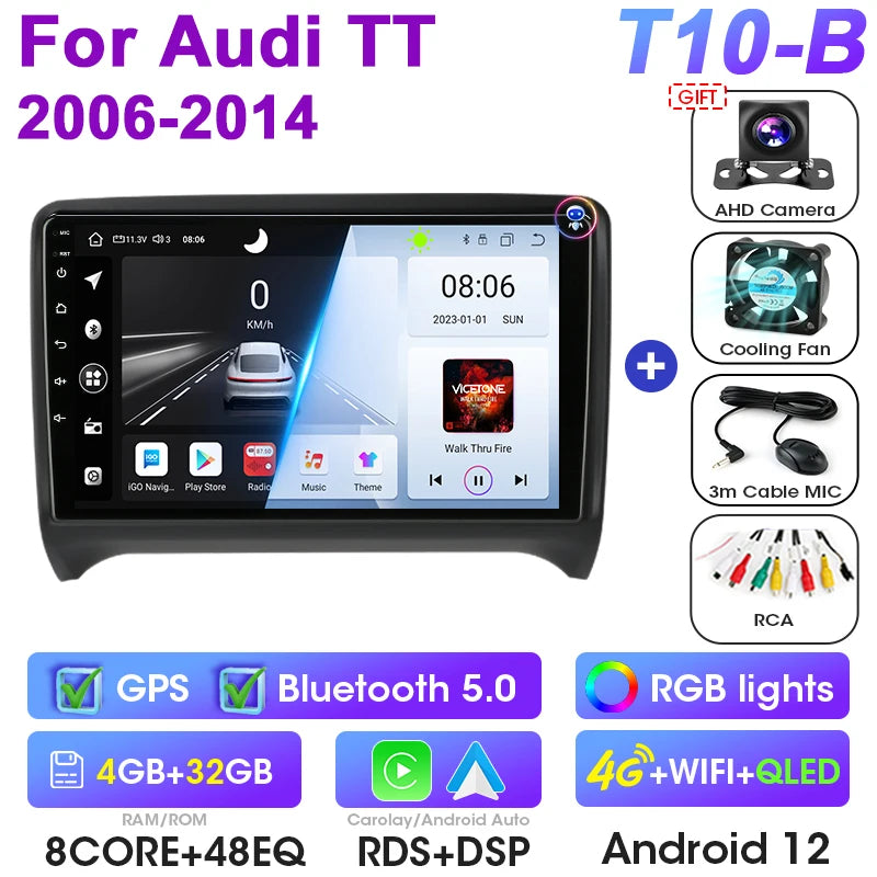 Bilradio 2-Din til Audi TT MK2 Android 12, 10-tommer touchscreen, GPS, 4G, CarPlay