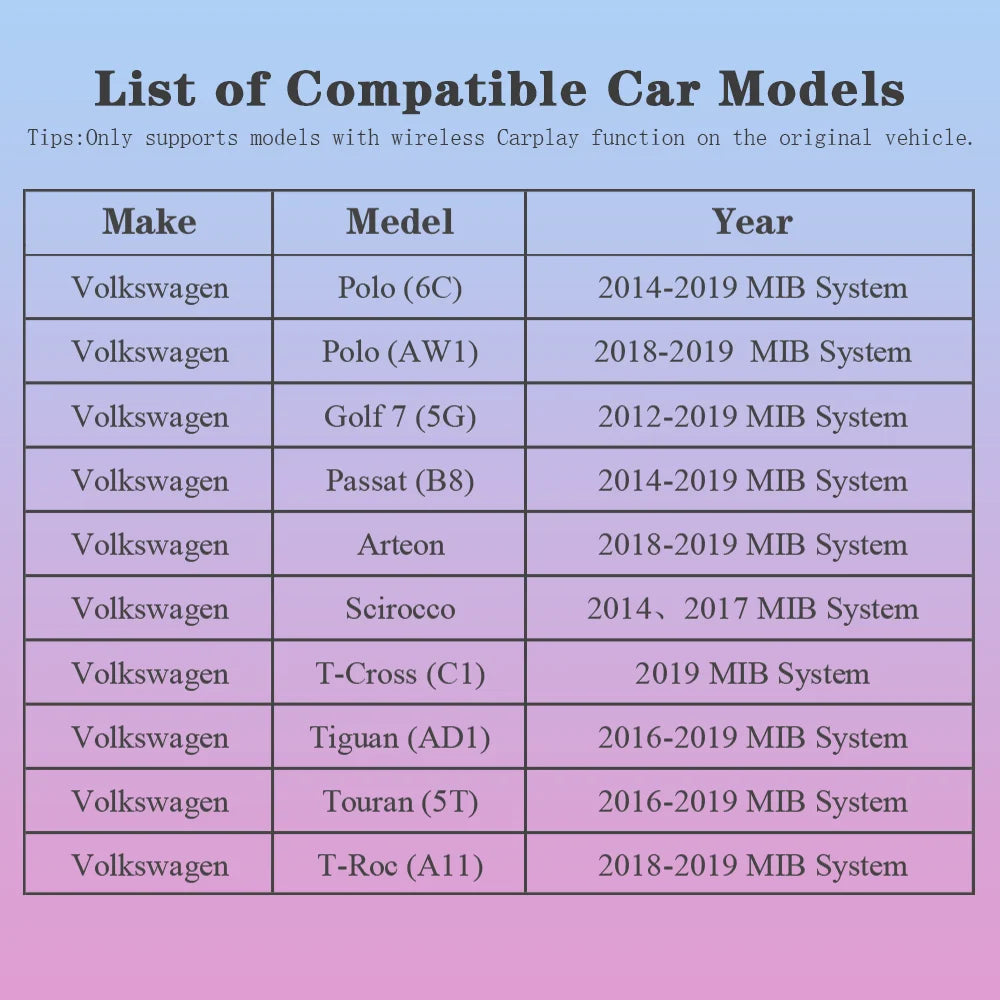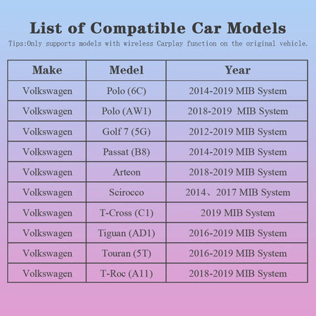 - Sømløs trådløs CarPlay og Android Auto i din VW til kort, beskeder og medier på bilens display.