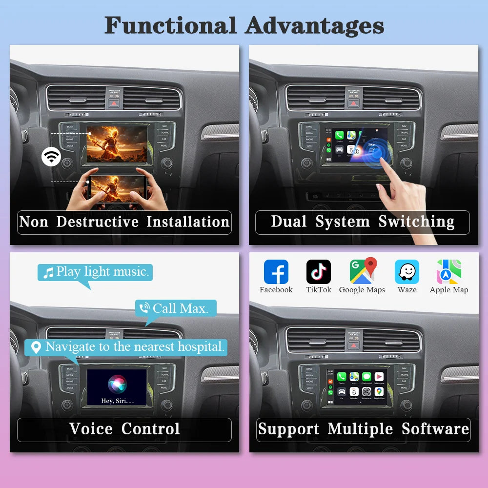 Designet til daglig brug, gør denne CarPlay Android Auto-interface navigation, musikstreaming og hurtig app-adgang problemfrit, mens du kører. Det hjælper med at reducere rod fra kabler og holder vigtige funktioner inden for rækkevidde, så du kan forblive fokuseret på vejen.