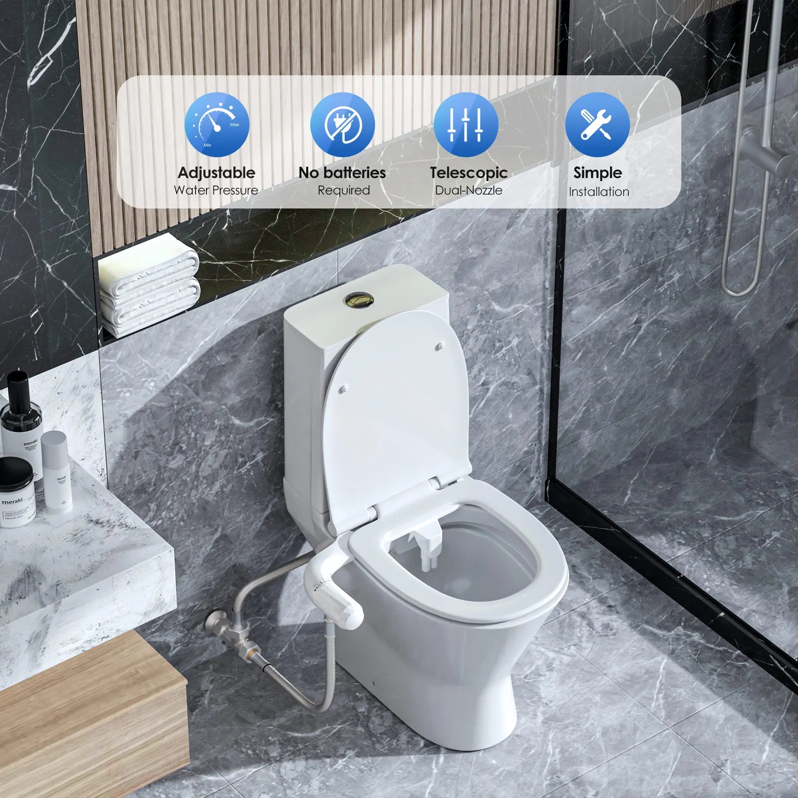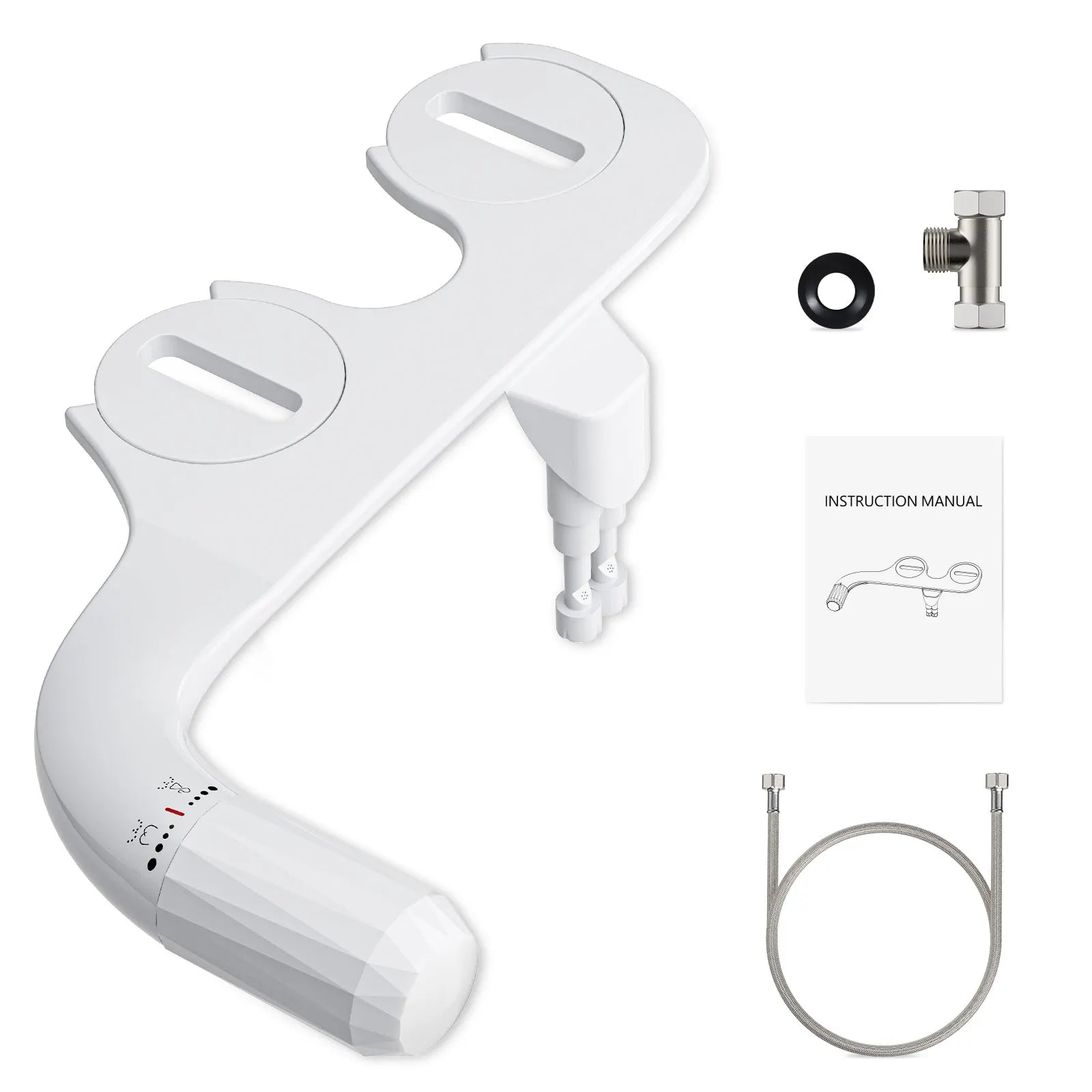 Installationen er hurtig og enkel i tre trin: fjern toiletsædet, monter bidet-tilbehøret ved at justere fastgørelsesdelene med monteringshullerne og fastgør, og tilslut derefter vandforsyningen med den medfølgende T-adapter. Det er designet til at passe til de fleste standard bidetsæder med en ultratynd profil og en dobbelt dyse-konfiguration.