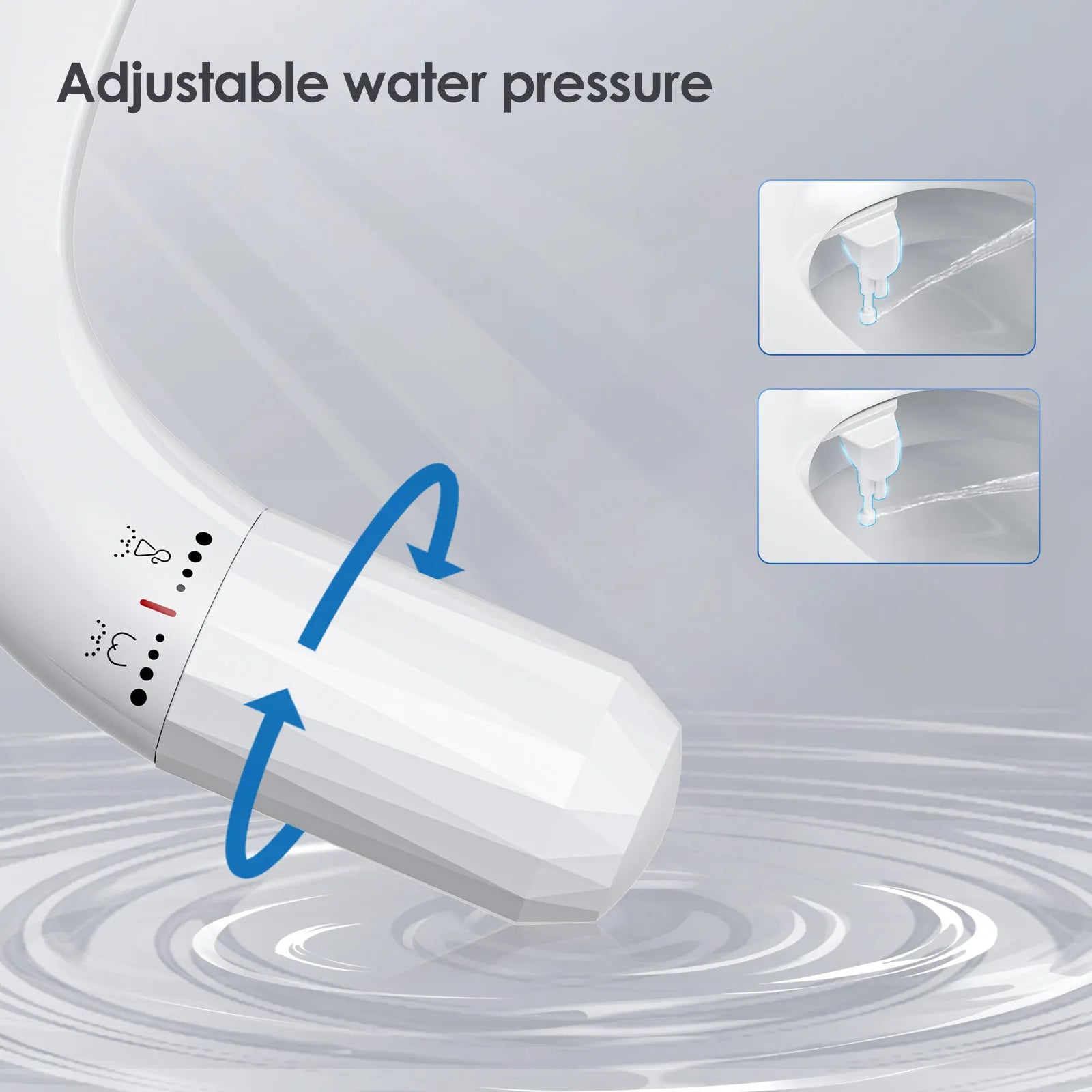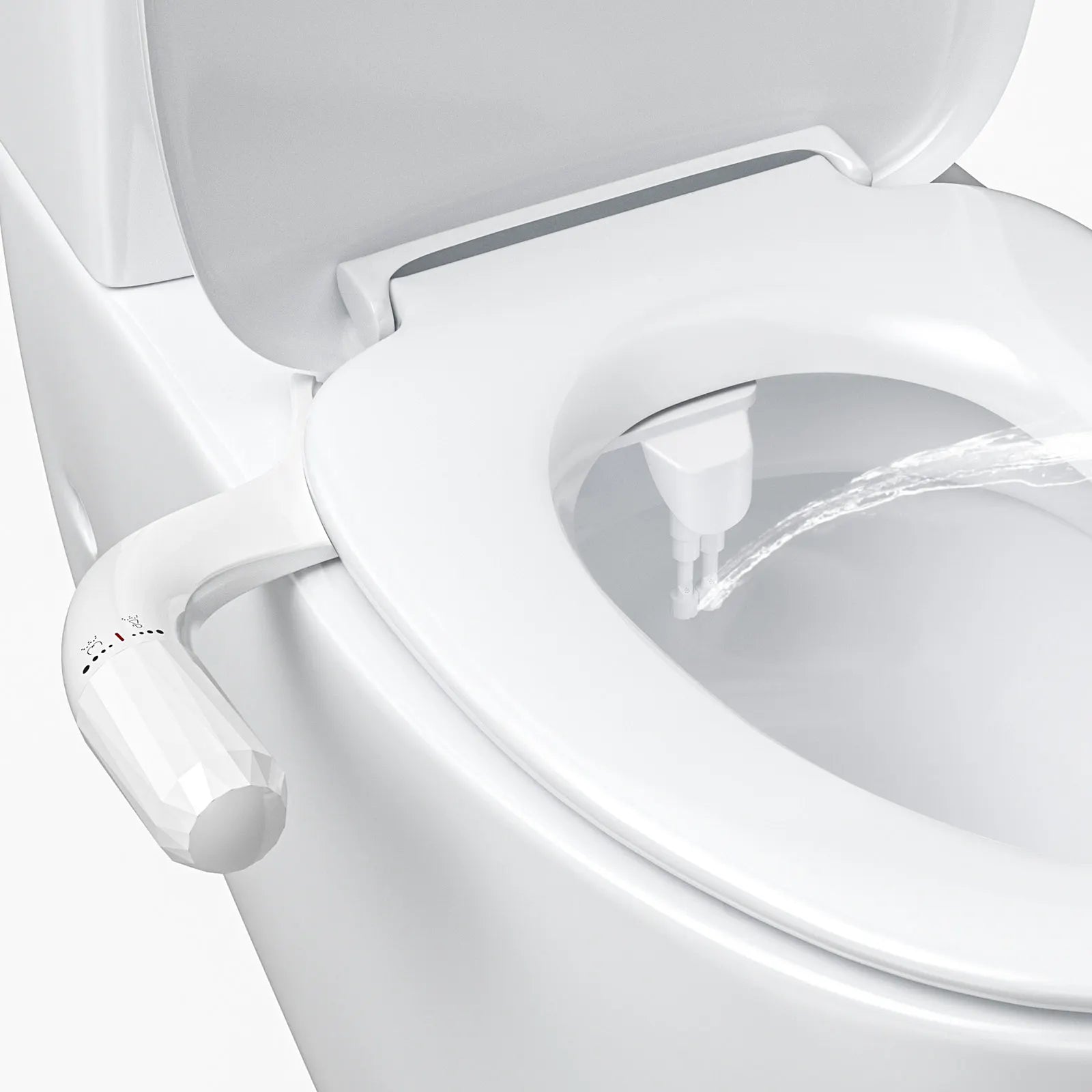 Kontrol og tilpasning er nemt med det diamantformede håndtag. Drej med uret mod enden for stærkere vandtryk, eller mod uret for en mildere spray—perfekt til forskellige brugere og præferencer. Sprayen er orienteret horisontalt for præcis rengøring og kompatibilitet med de fleste toiletter takket være den 2-hullede montering.