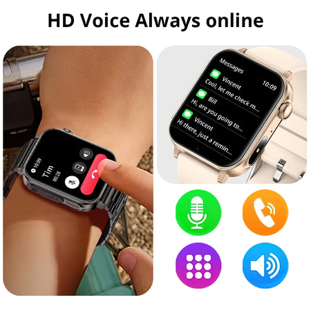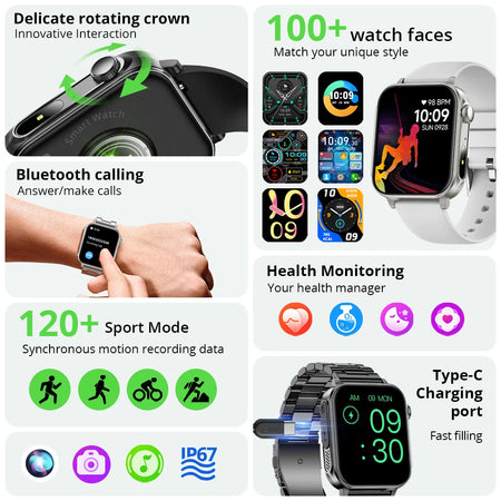 Introduktion af COLMI P80 Smartwatch Health Tracker—dit alsidige bærbare til sundhedsindsigt, aktiv livsstil og bekvemmelighed på håndleddet. Fremstillet med et rustfrit stål-armbånd og et stålhus, kombinerer P80 moderne stil med holdbarhed. Den har en 1,83-tommer kvadratisk IPS-skærm med en glasurskive og en skarp 240x296 opløsning for klar læsbarhed dag og nat. Spor skridt, afstand, kalorier og en række aktiviteter med flere sportsfunktioner, mens du overvåger din puls, blodilt, søvn og stress for at afdække meningsfulde sundhedstendenser. Hold forbindelsen med smarte notifikationer for opkald, beskeder og app-advarsler, alt sammen fra dit håndled. COLMI Fit-appen er angivet som følgesvend, med app-download tilgængelighed noteret som ikke påkrævet i alle regioner, hvilket giver fleksibel brug. En fremtrædende funktion er universel Type-C opladning, så du kan bruge den samme oplader til flere enheder og nyde hurtigere, mere bekvem strøm, når du har brug for det.