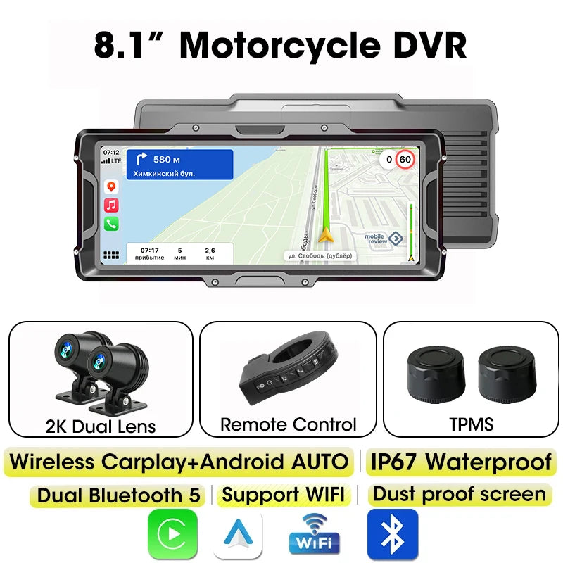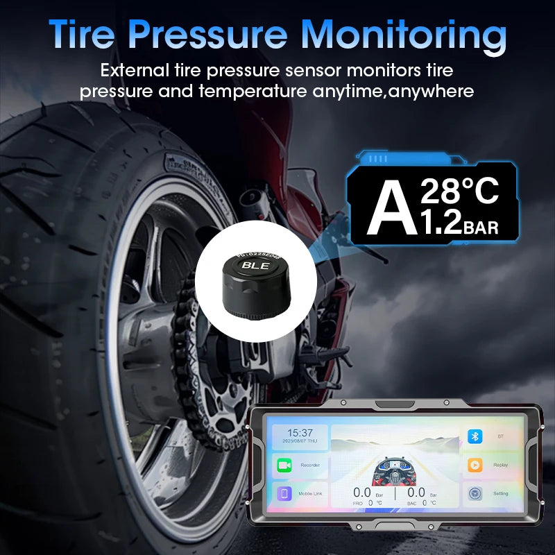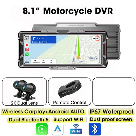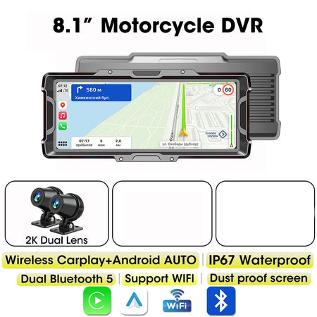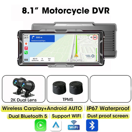 Mød Develuck 8,1 tommer Motorcykel DVR, et robust, alt-i-et system designet til at beskytte dig på hver tur. Dette dual-kamera setup optager for- og bagud i skarp 2K opløsning, hvilket hjælper dig med at dokumentere hændelser, forbedre kørevaner og gennemgå ruter nemt. Indbygget GPS-navigation, trådløs CarPlay og Android Auto samt valgfrie TPMS-sensorer holder dig på sporet og i kontrol, selv på lange ture. Den 8,1 tommer touchscreen giver klar synlighed, mens et holdbart vandtæt, anti-dug og anti-vibrationsdesign sikrer pålidelig ydeevne i al slags vejr. Med funktioner som G-sensor, bevægelsesdetektion, cyklisk optagelse, tids- og datovisning samt realtids overvågning kan du køre med selvtillid. Vælg mellem fire varianter—Moto DVR, Moto DVR TPMS, Moto DVR Button og Moto DVR TPMS Button—og tilpas systemet til dine behov. Bemærk: inputstrøm skal være 12V for at starte; strøm via Type-C kan forårsage genstart på grund af utilstrækkelig spænding. For CarPlay/Android Auto, følg app-forbindelsestips, hvis du oplever forbindelsesproblemer. Dette wifi-modul er kun til app-forbindelse og giver ikke internetadgang. Vores hjelm-Bluetooth mulighed lader dig nyde musik sikkert under kørsel, da enheden ikke inkluderer eksterne højttalere.