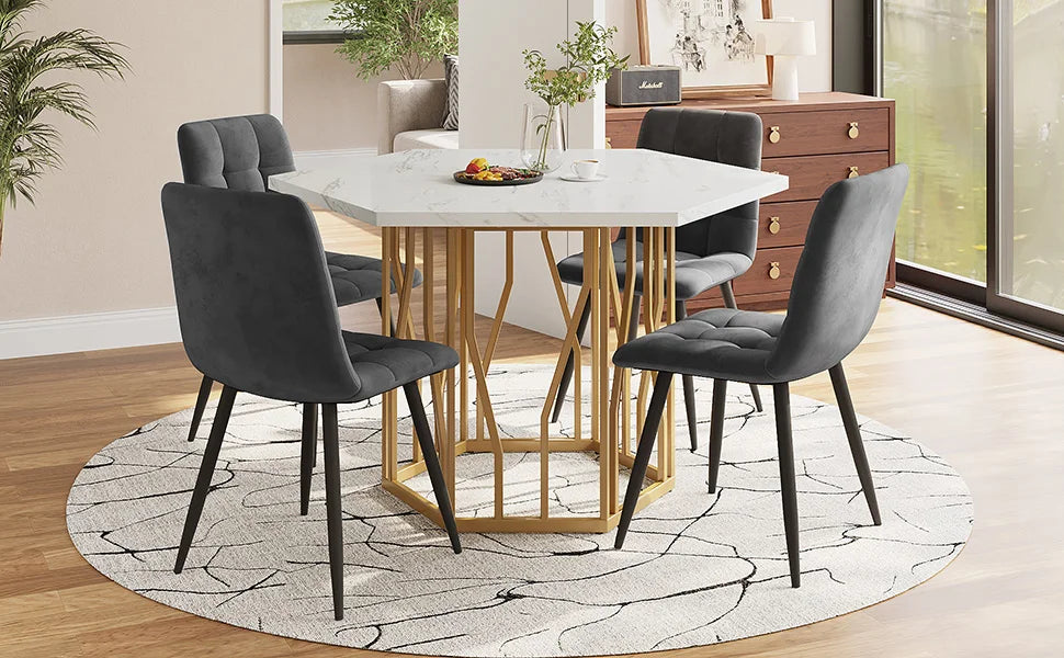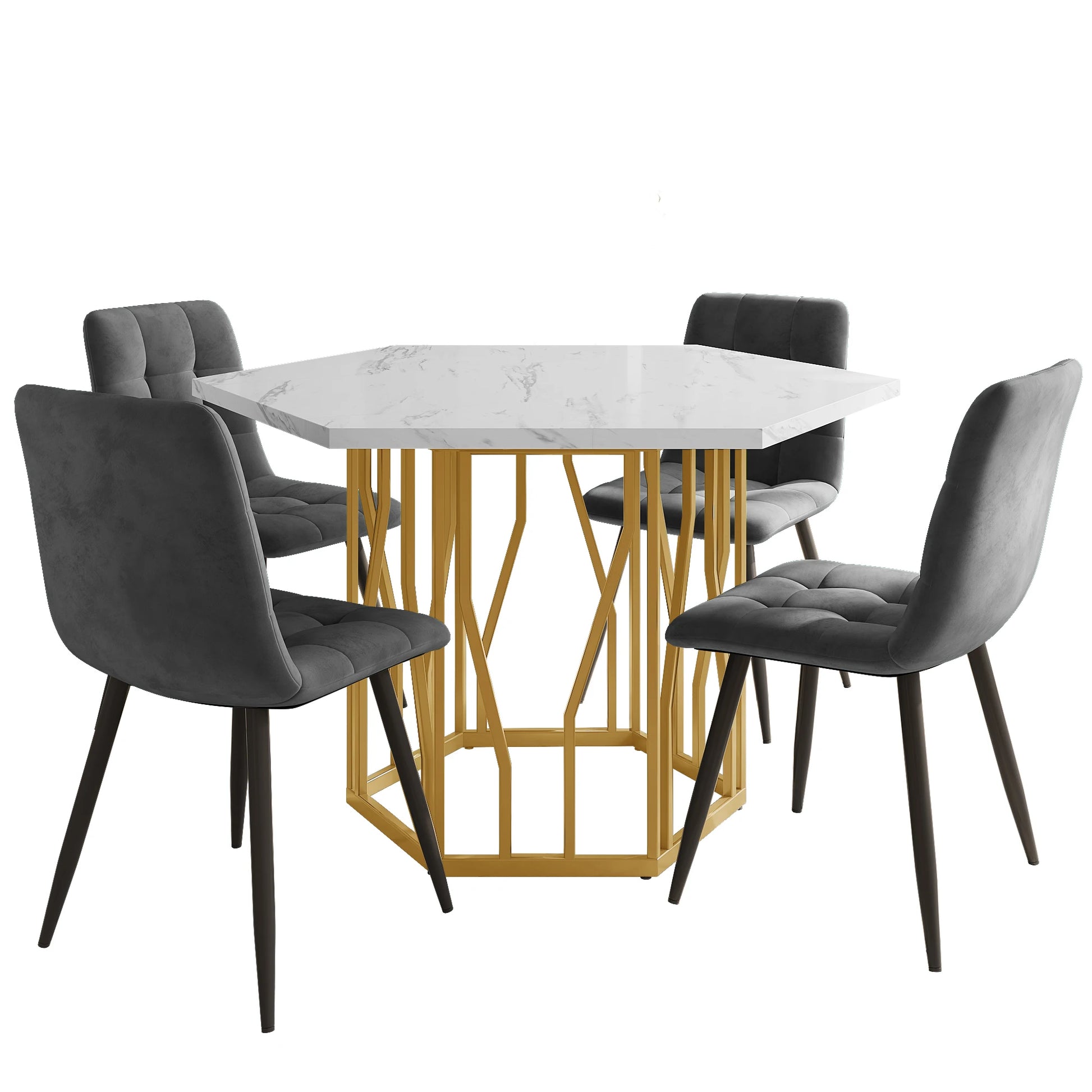 Hexagonal Spisebord Med Grå Velour Stole 5 Stykker