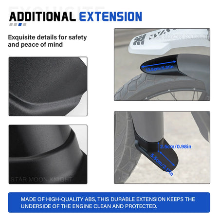 Opgrader din Himalayan 450 med Star Moon Knight Fender Extender, en holdbar ABS-plast forreste stænkskærmsbeskytter designet til modeller fra 2024-2025. Ved at forlænge den originale forreste skærm hjælper den med at beskytte dit udstødningsmanifold, nederste motor og køler mod snavs, mudder og sten, der kastes op på støvede eller off-road ture. Dette praktiske tilbehør holder kritiske komponenter renere, reducerer slid forårsaget af snavs og hjælper med at opretholde optimal ydeevne uden en stor investering.