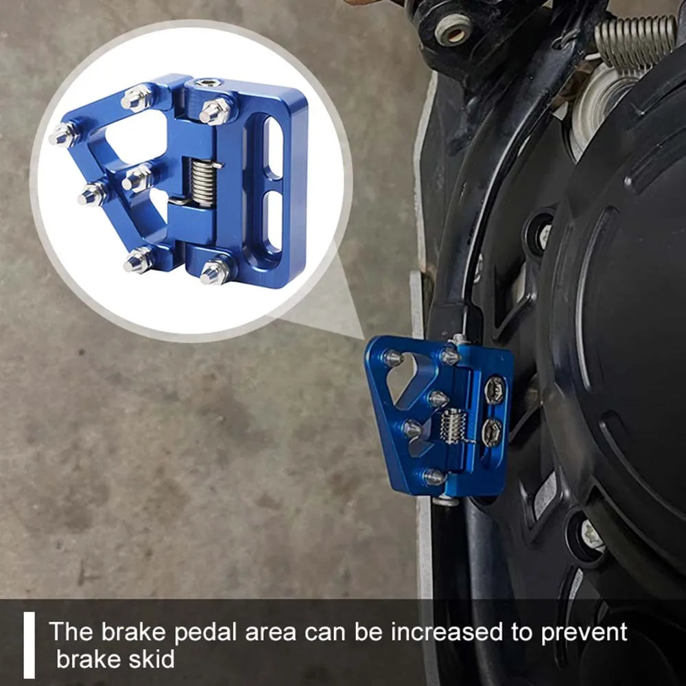 Foldbar Pedal: Den drejer på en rustfri stålpind og fjeder, hvilket tillader pedalen at folde væk ved stød og beskytte armen mod skader under kørsel på ujævnt terræn. Fri Justering: Frem- og tilbagejustering giver dig mulighed for at tilpasse bremserækkefølgen for maksimal komfort og ydeevne. Sikrere Bremsning: En forlænget, serrateret overflade giver pålidelig greb og forbedret bremsepræcision under alle forhold, hvilket hjælper dig med at kæmpe om podieplaceringer. Robust Aluminium: Fremstillet af premium 7075-T6 aluminium for styrke med minimal vægtøgning. Skridsikker: 7 rustfri ståltænder leverer fremragende bid og forhindrer glid, selv under våde eller mudrede forhold.