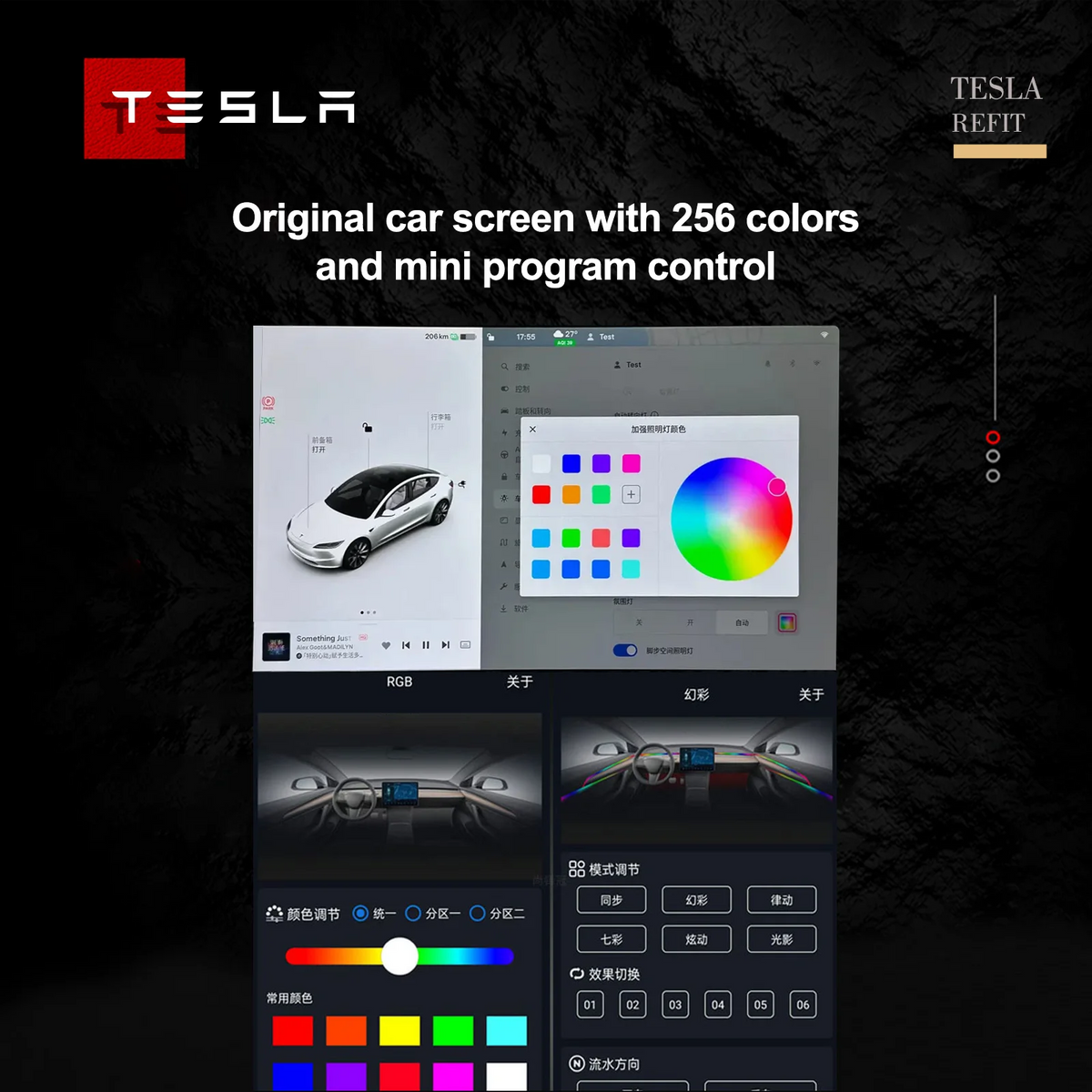 - Kontrolinterface: Lysfarve og lysstyrke justerbar og synkroniseret via Tesla's centrale touchscreen.