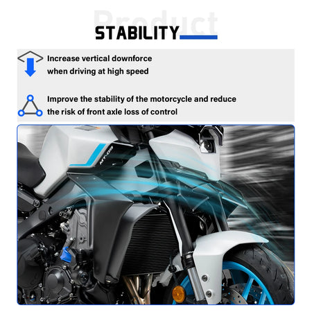 Opgrader din Yamaha MT-09 eller MT-09 SP (2024-) med Front Spoiler Kit til Downforce Winglets. Fremstillet af holdbar ABS-plast forbedrer denne frontspoiler både æstetik og aerodynamik, hvilket giver din naked bike et mere aggressivt udseende samtidig med, at den aktivt former luftstrømmen for at beskytte radiatoren og forbedre forhjulsstabiliteten. Spoileren leder luft mod radiatoren og leverer takket være sit aerodynamiske design næsten 2 kg nedadgående kraft på forhjulet. Dette omsættes til en anti-wheelie effekt, reduceret forhjulsrystelser ved høje hastigheder samt mere stabil opbremsning og styring for en glattere og mere selvsikker kørsel.